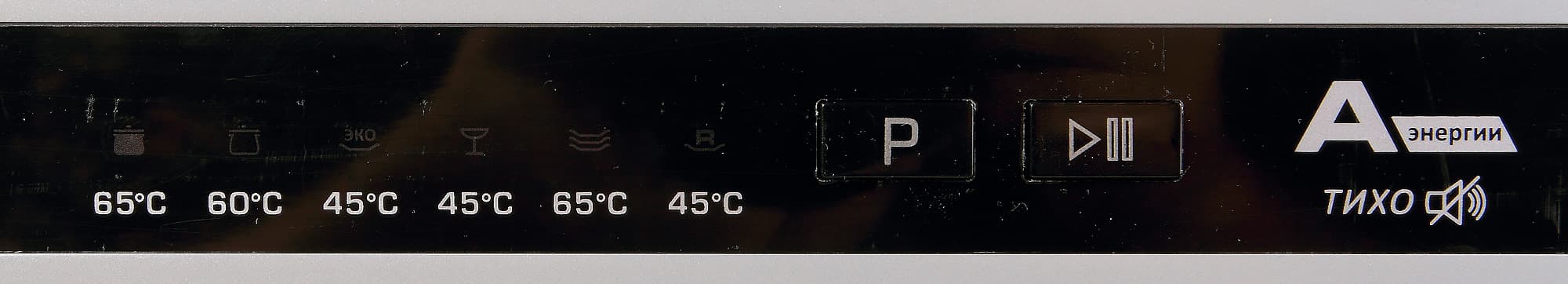 В правой части панели расположены значки-световые индикаторы программ мытья посуды. Под каждым режимом указана температура нагрева воды. Кнопка «P» управляет листанием режимов, кнопка «Пуск/пауза» запускает работу программы.