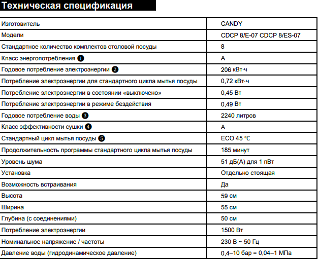 Candy CDCP 8ES-07 — машина, не вызывающая нареканий в отношении технических характеристик. Особенно следует отметить низкий уровень шума и стабильность положения предметов посуды в процессе мытья. За все время тестирования посудомойки мы не обнаружили в конце цикла ни одного опрокинутого стакана или бутыли — и это действительно важный субъективный показатель.