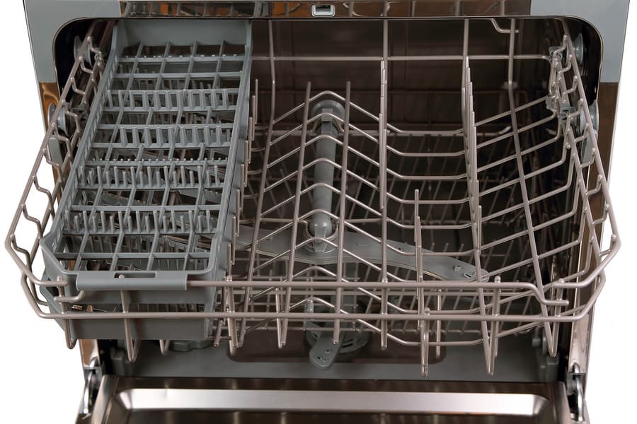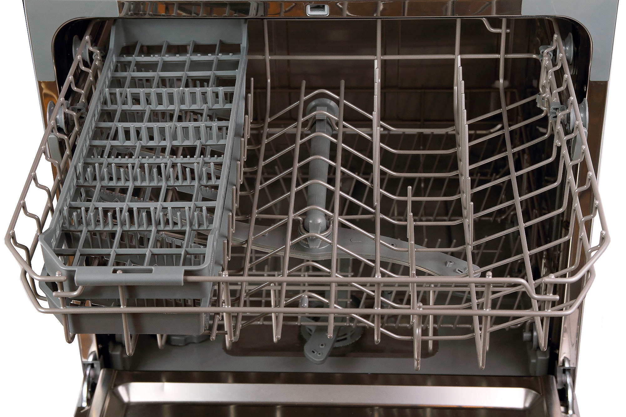 Верхняя корзина катается на трех роликах с каждой стороны: два сверху рельсы и один снизу. Конструкция находится в соответствии с современными трендами: корзина располагается очень близко к потолку машины; и в ней находится съемный горизонтальный лоток для столовых приборов, пришедший на смену старой привычной корзинке для вертикальной установки приборов.