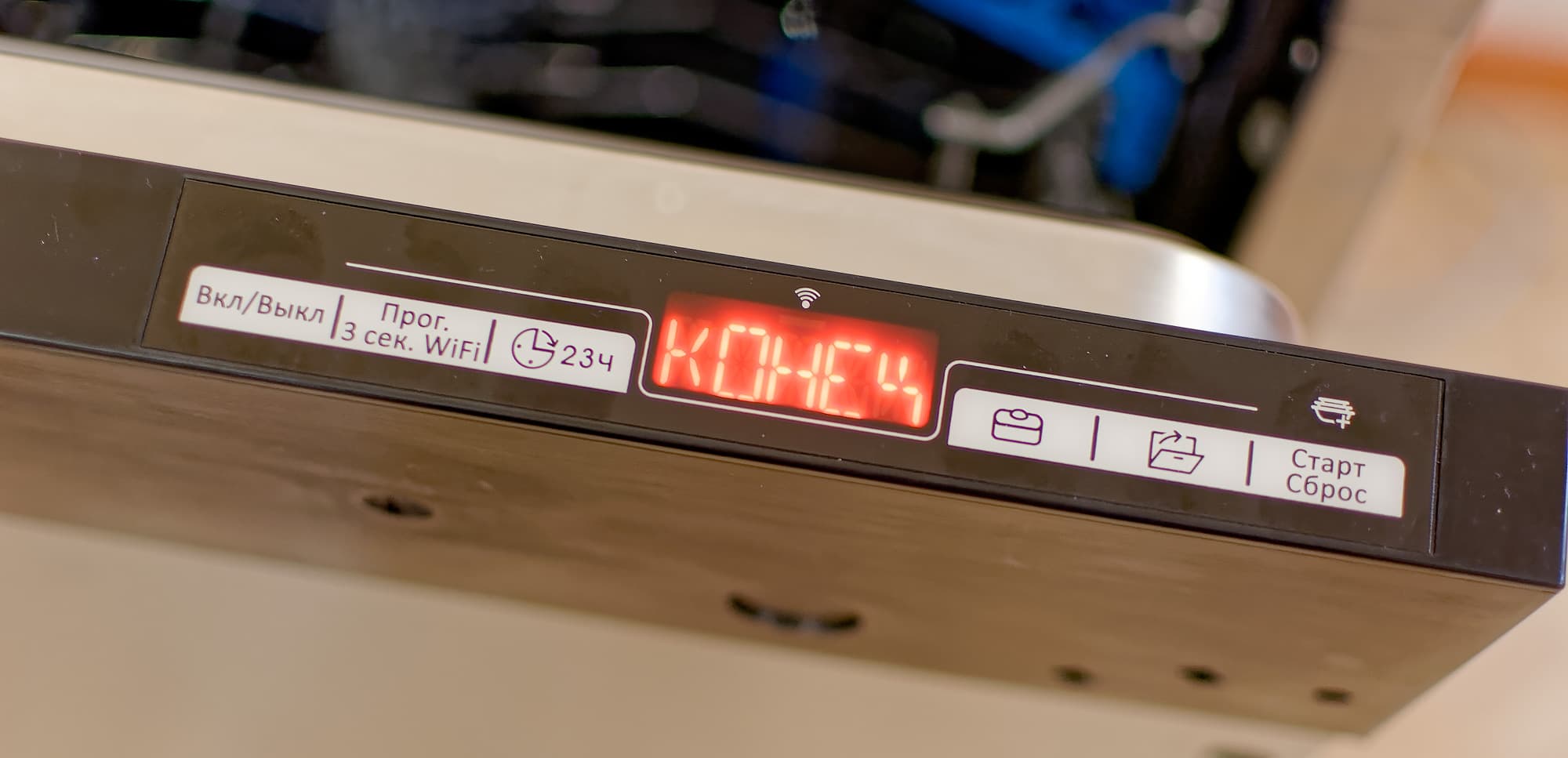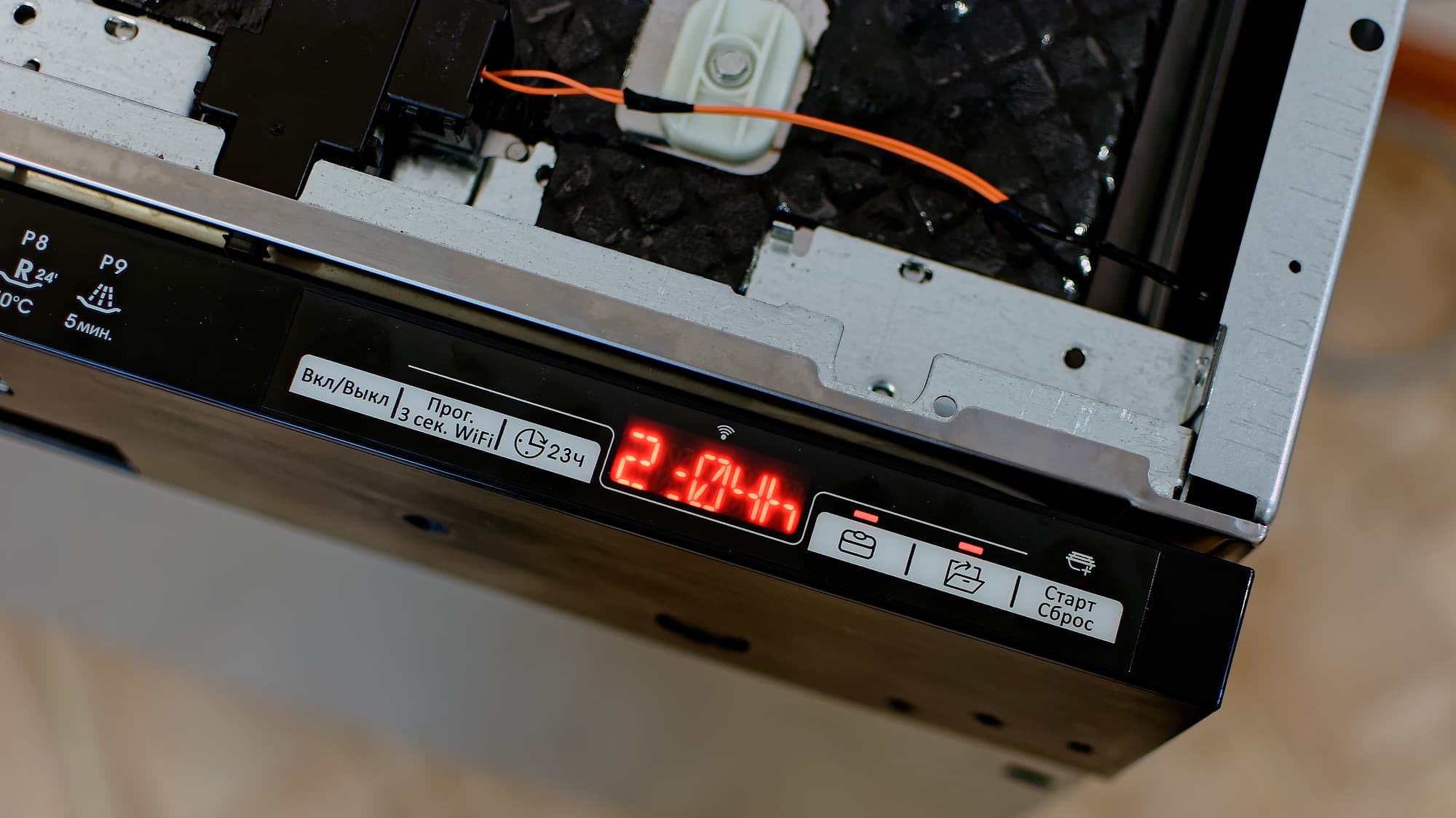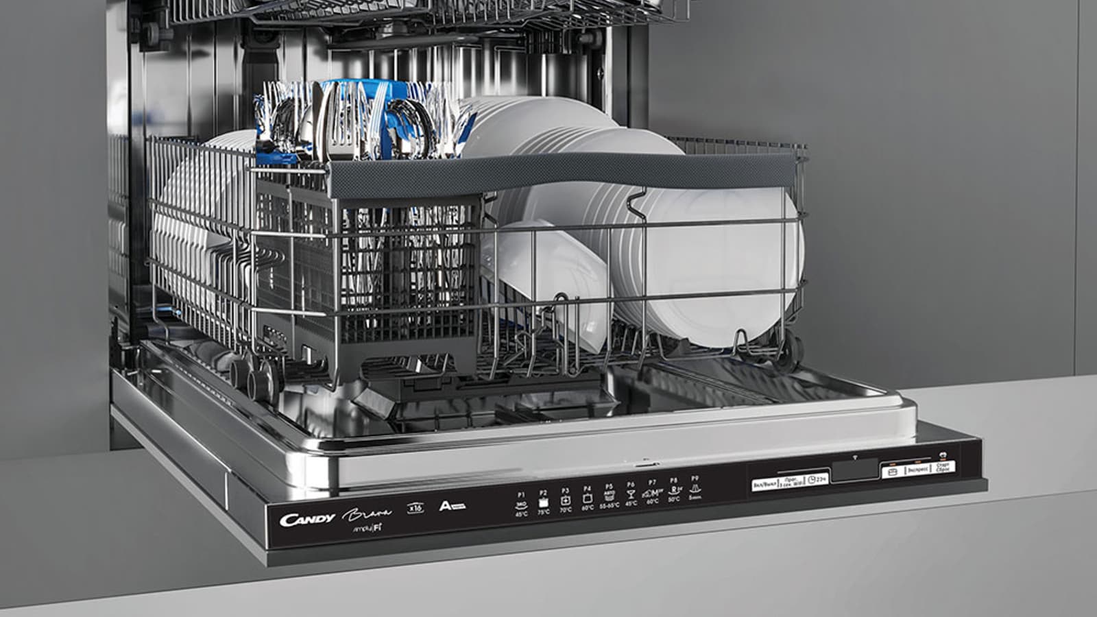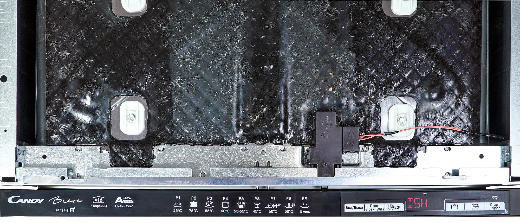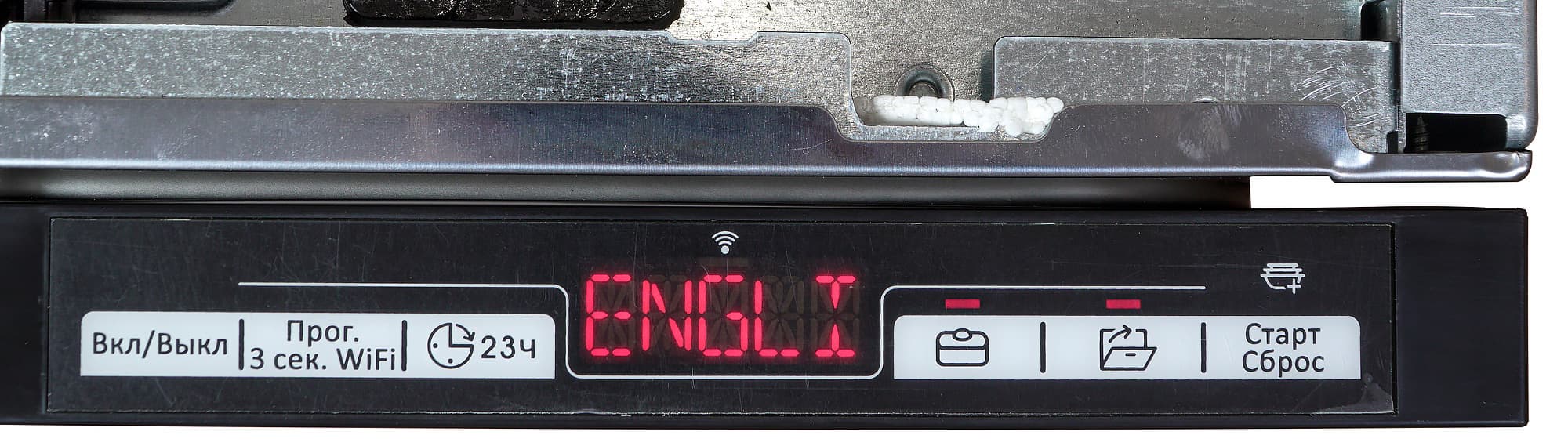 Функция открытия дверцы по окончании программы — штука, безусловно, очень удобная, но мы были несколько удивлены тем, что досушивание посуды таким способом в общее время выполнения программы как бы не входит: через две минуты после открытия посудомойка бодро сообщает об окончании работы. Отметим также неидеальную русификацию: например, несмотря на то, что был выбран русский язык, таймер обратного отчета выводится явно в англоязычном формате.