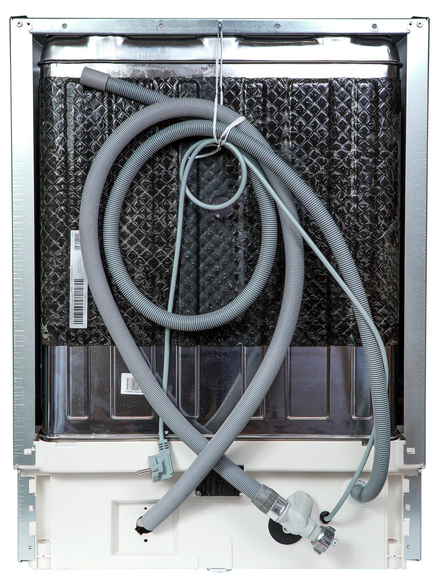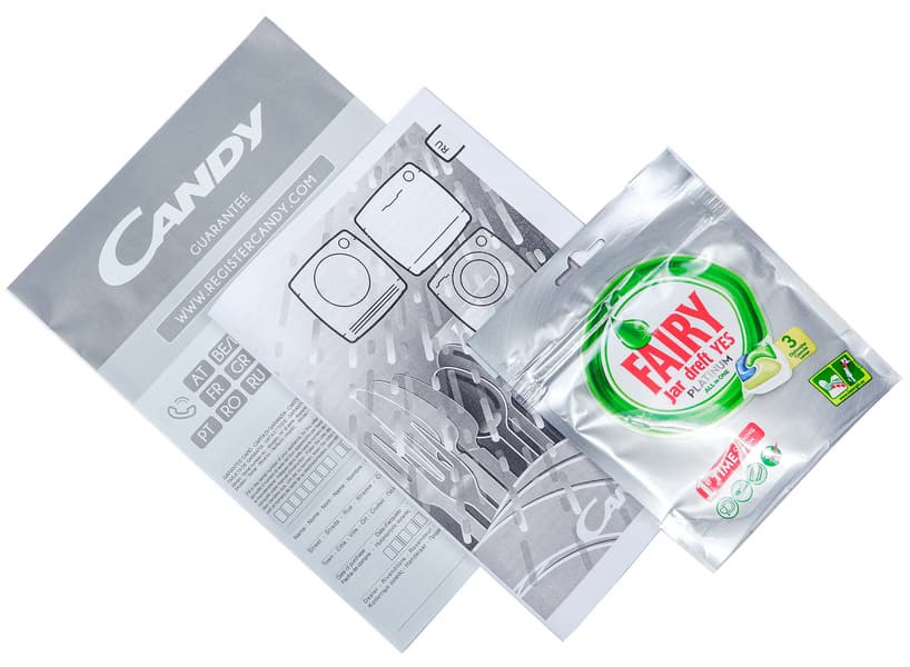 Прибор прибыл к нам в фирменной транспортировочной упаковке из картонных, пенопластовых и деревянных деталей, характерной для встраиваемой техники. Вскрыв коробку, внутри мы обнаружили саму посудомоечную машину в сборе со сливным и заливным шлангами, гарантийный талон, инструкцию, подарочную упаковку средства для мытья посуды (на четыре таблетки) и элементы крепежа.