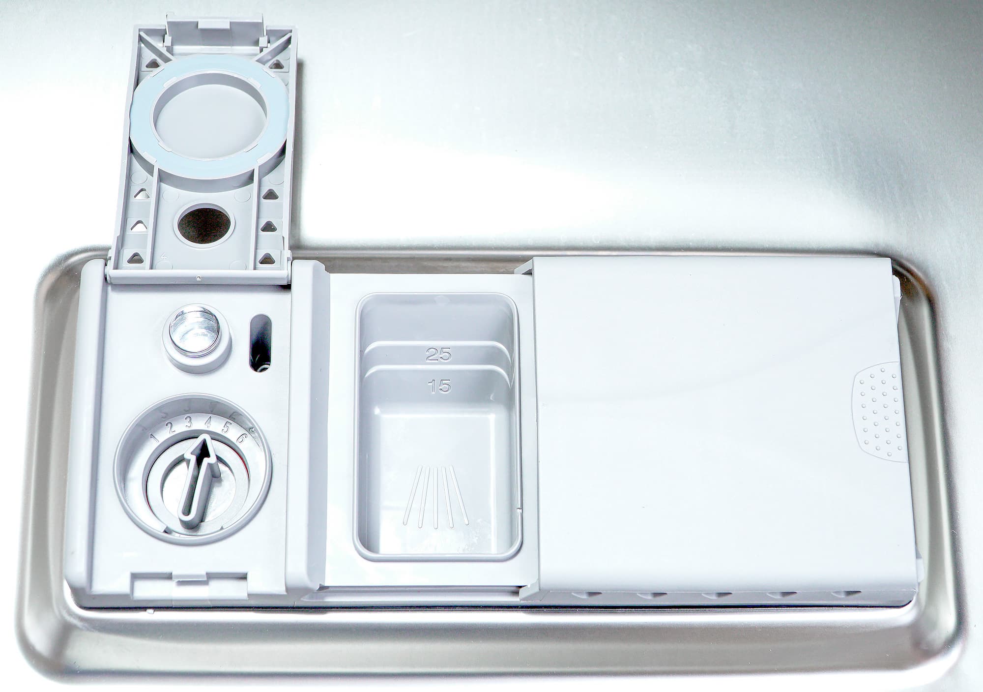 Конструкция дозатора стандартная — отделение для ополаскивателя, регулировка его подачи, оптический датчик наличия; отделение для моющего средства. Всё предсказуемо и интуитивно понятно.