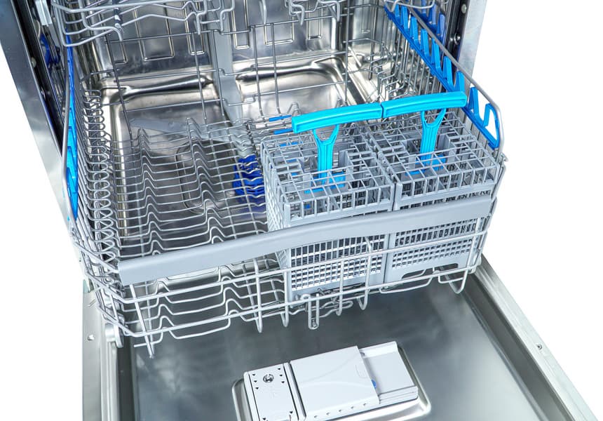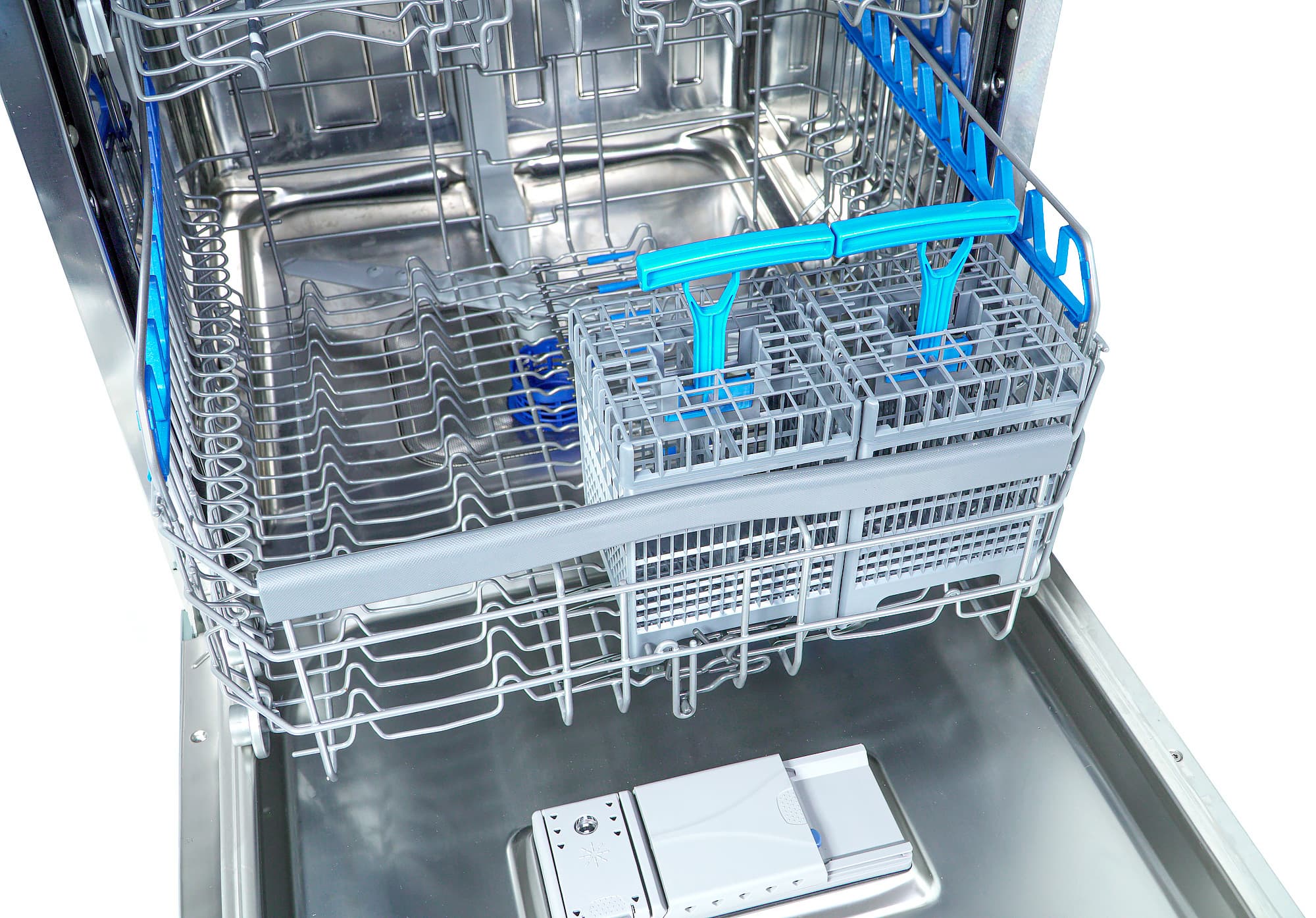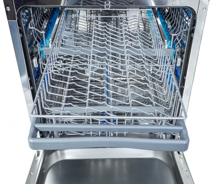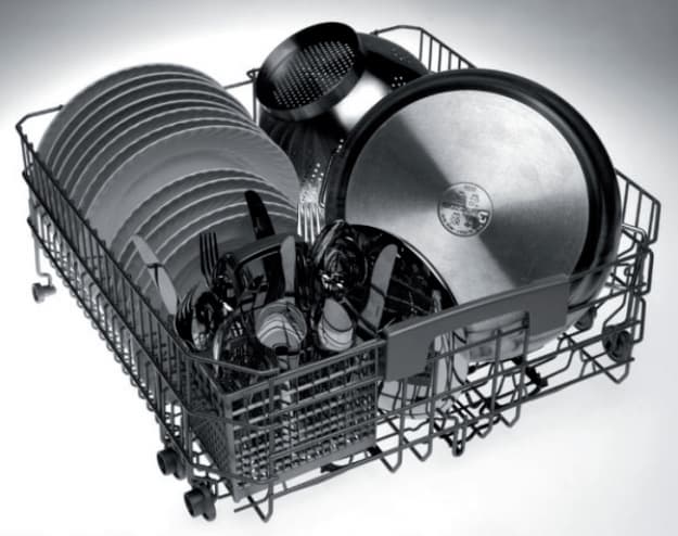 Корзины сконструированы, мы бы сказали, изобретательно, их целых четыре (учитывая корзинку для столовых приборов). Несмотря на отсутствие верхнего разбрызгивателя, качество мытья по факту оказалось на высоком уровне. Объем тоже не подвел: это действительно большая, просторная посудомойка, где можно разместить много посуды.