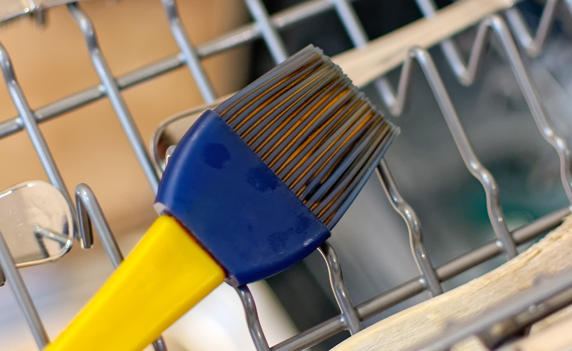 В верхней корзине отмылось всё, за исключением двух артефактов: кисточки, которой измазывали посуду («грязь» застряла между силиконовыми щетинками).