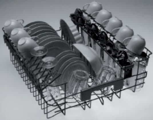 Верхняя корзина не имеет никаких модификаторов и по задумке производителя предназначается не только для столовых приборов, но и для небольших блюдец (укладываемых горизонтально «внахлест»), низких маленьких чашек, рюмок, и тому подобного.