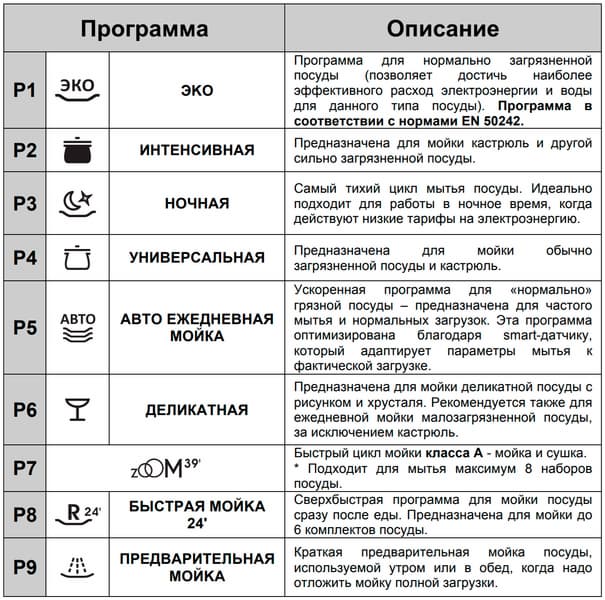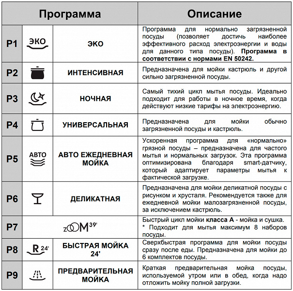 К сожалению, в этот раз таблица с описанием программ не содержит информации ни о длительности их выполнения, ни о расходе электроэнергии и воды. Впрочем, мы уже говорили, что документация, попавшая к нам, не выглядит как окончательный вариант.