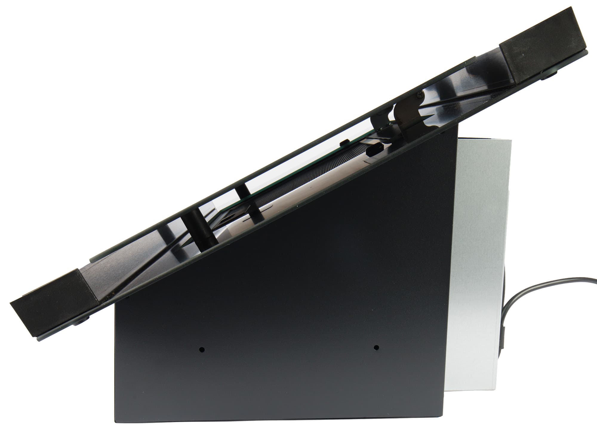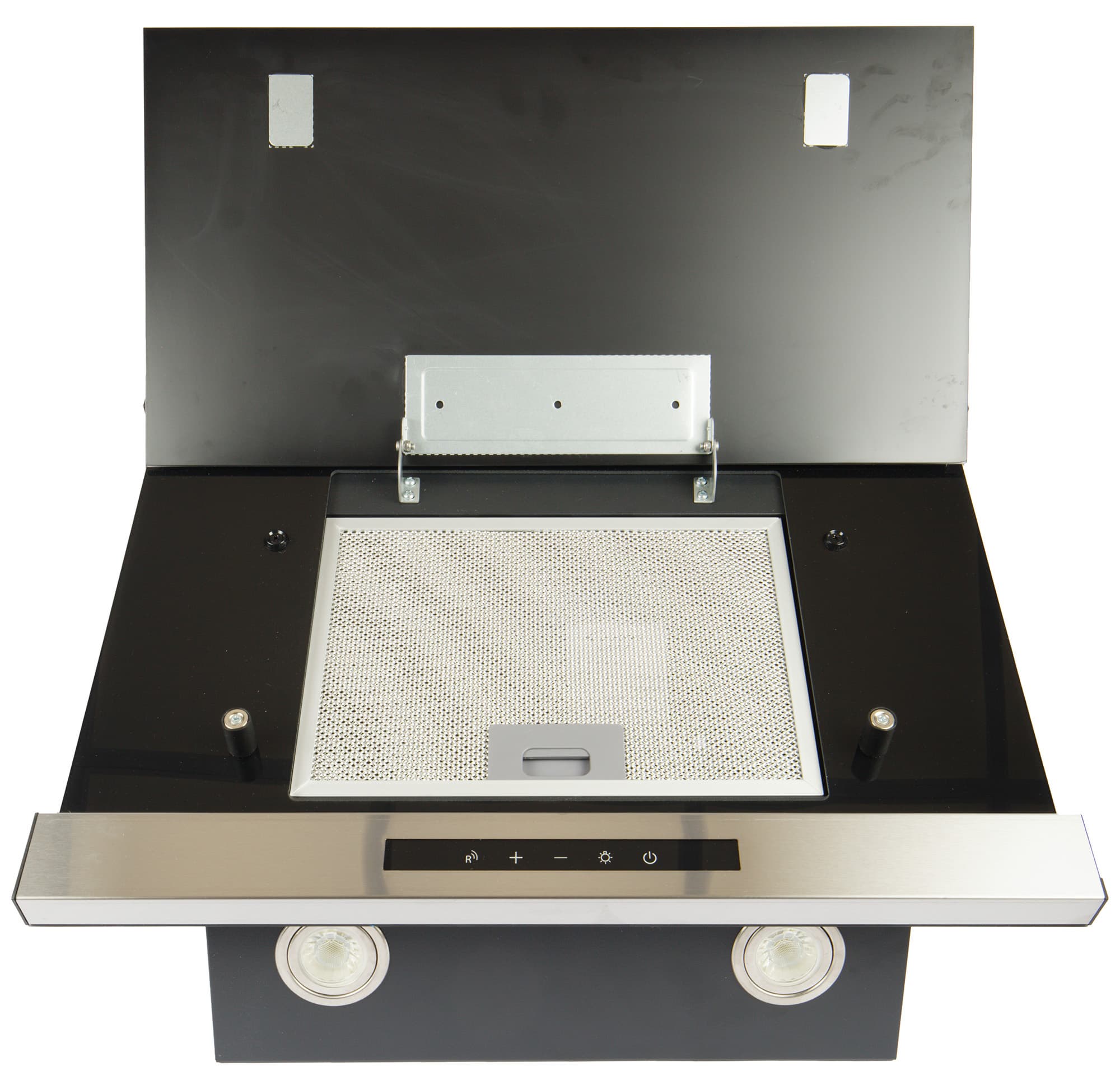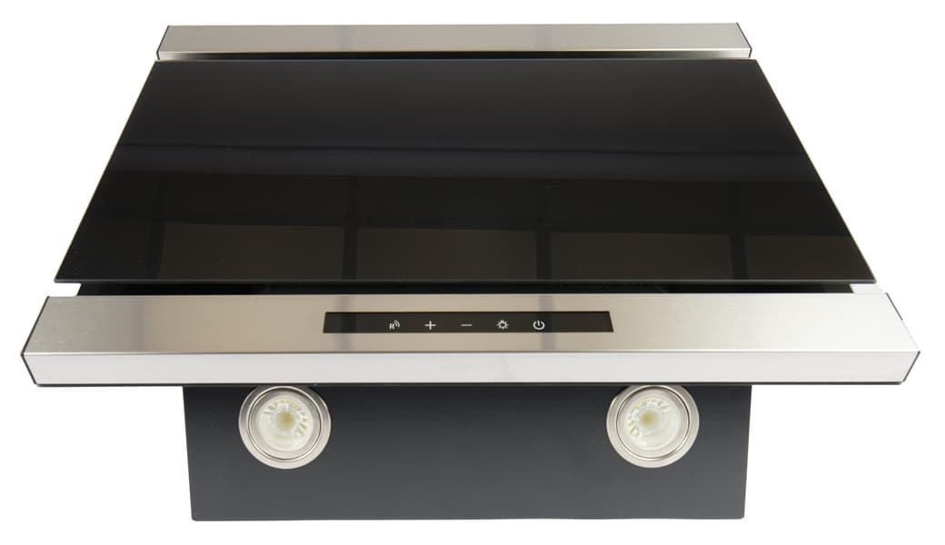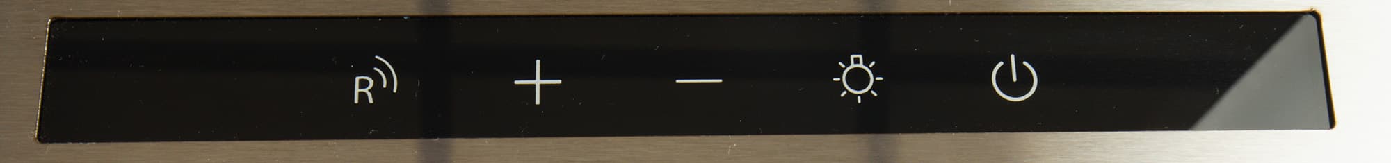 Большую часть площади передней стороны занимает откидывающийся вверх стеклянный экран, под которым скрывается алюминиевый антижировой фильтр. Сверху и снизу экрана расположены полосы из матированной нержавеющей стали. В нижнюю встроена сенсорная панель управления.