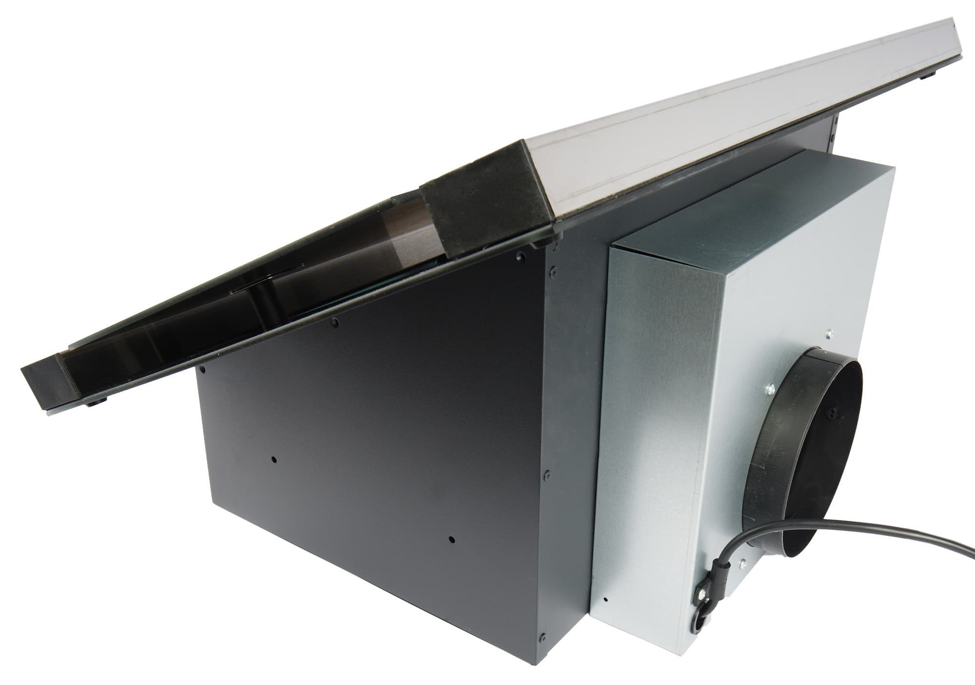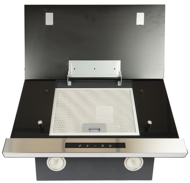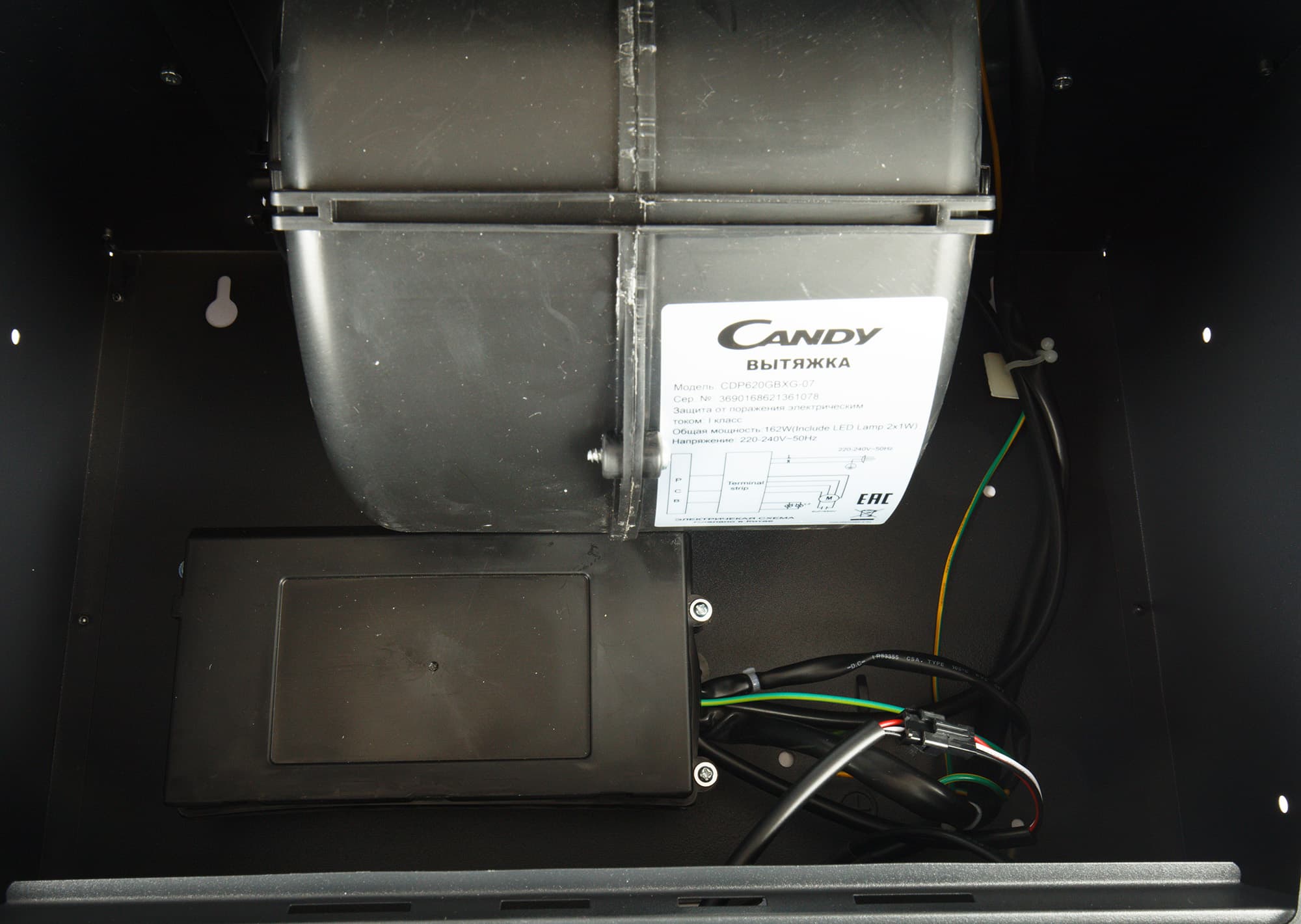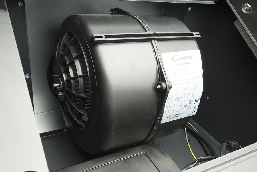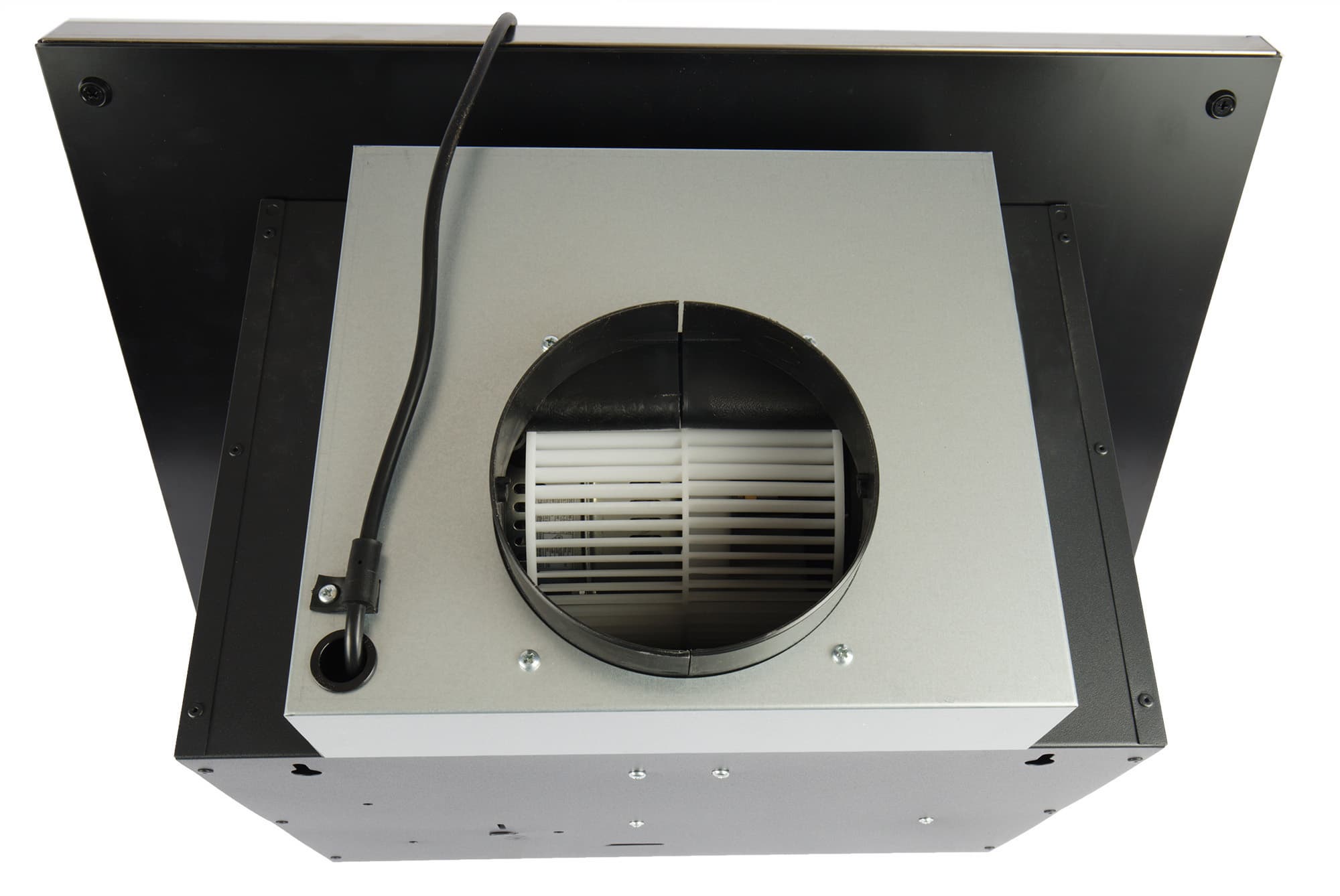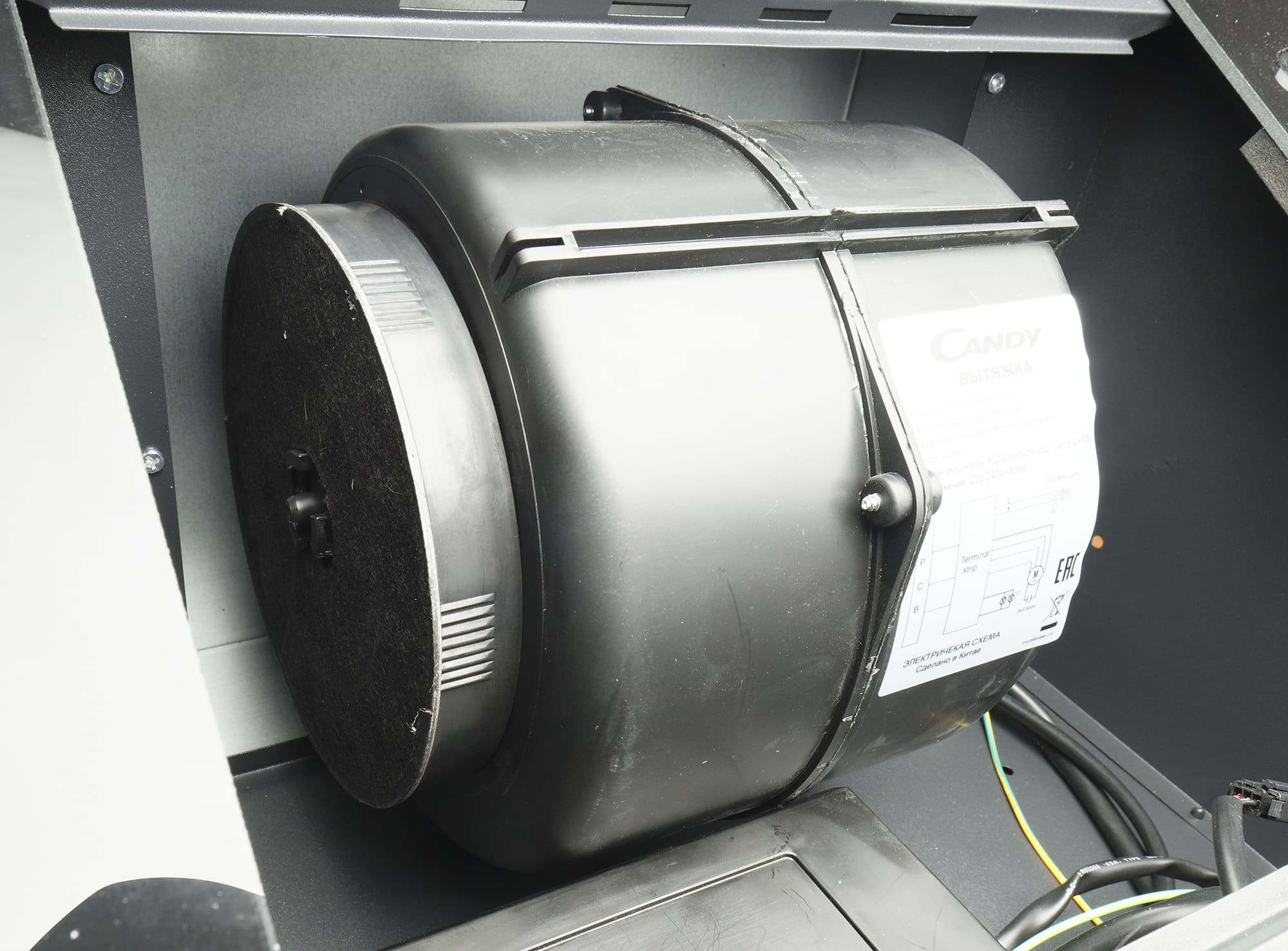 Под фильтром, во внутреннем пространстве, находится центробежный вентилятор в цилиндрическом корпусе. Если вытяжка не подключена к шахте вентиляции и используется в режиме рециркуляции, на его торцах следует разместить угольные фильтры, задерживающие жир, запахи и пыль. В комплект они не входят и приобретается отдельно.