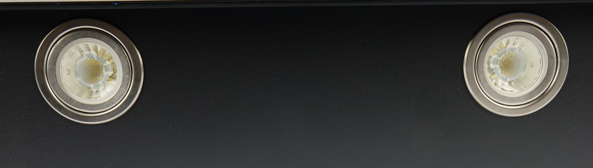 За освещение рабочей зоны отвечают два круглых светодиодных светильника, встроенные в нижнюю часть вытяжки.