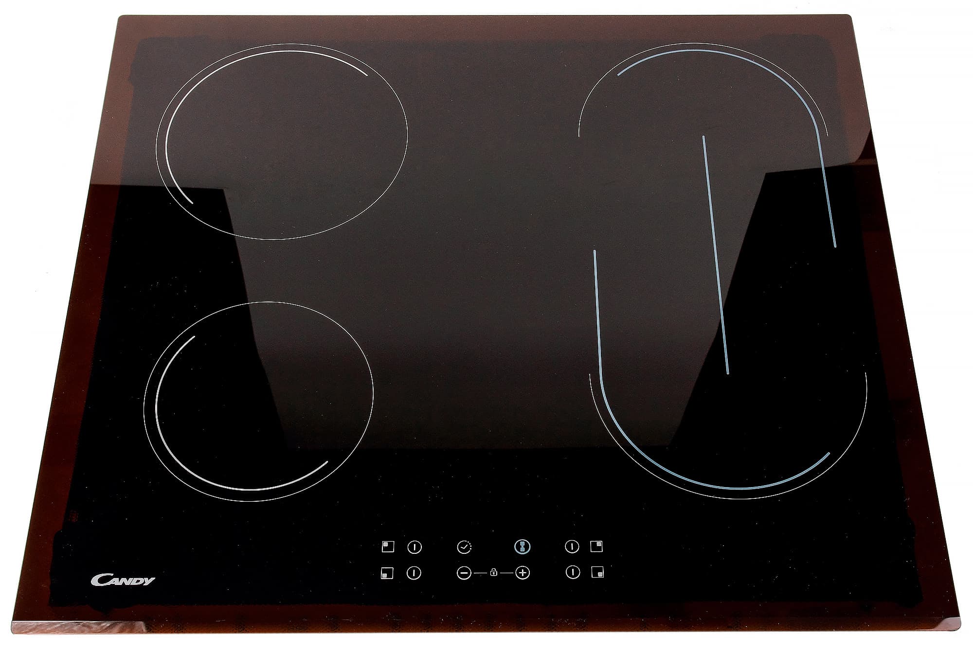Любая стеклокерамическая плита с сенсорным управлением выглядит более-менее одинаково, и наша сегодняшняя героиня исключением не является. Как правило — это черное (в данном случае на просвет скорее темно-коричневое) стекло, на котором белым цветом «нарисованы» органы управления и очертания конфорок. Именно поэтому такие варочные панели очень легки в уходе: вам просто нужно протереть стеклокерамическую поверхность — и все. Никаких выступов, кнопочек, рычажков и прочего. Просто ровное стекло.