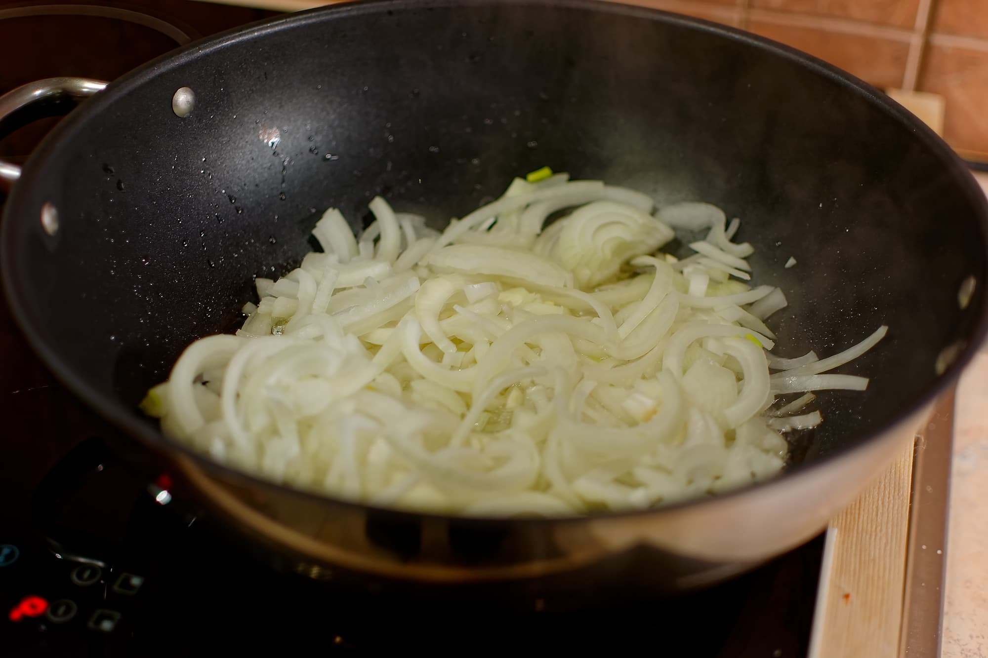 На первом же этапе мы как следует раскалили масло, и опустив в него лук, поняли, что такой объем сразу остудил наше масло. Поскольку это был самый максимальный нагрев из возможных, мы убедились, что не надо ждать чудес и пора создавать их самостоятельно.