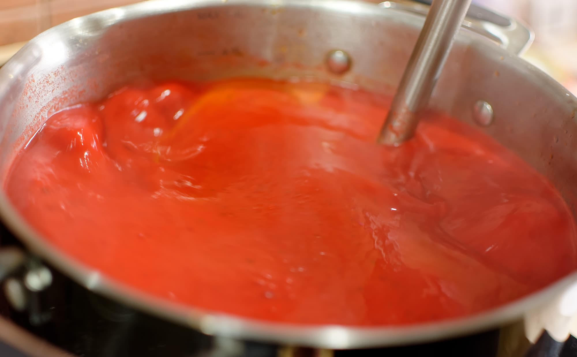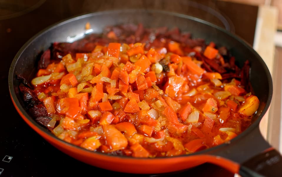 Мы взяли овощи, которые присутствуют во многих видах борща: лук, морковь, свеклу, болгарский перец и томат. План был такой — обжарить все это на сковороде, потушить с томатной пастой, разбавить бульоном и получить суп-пюре.