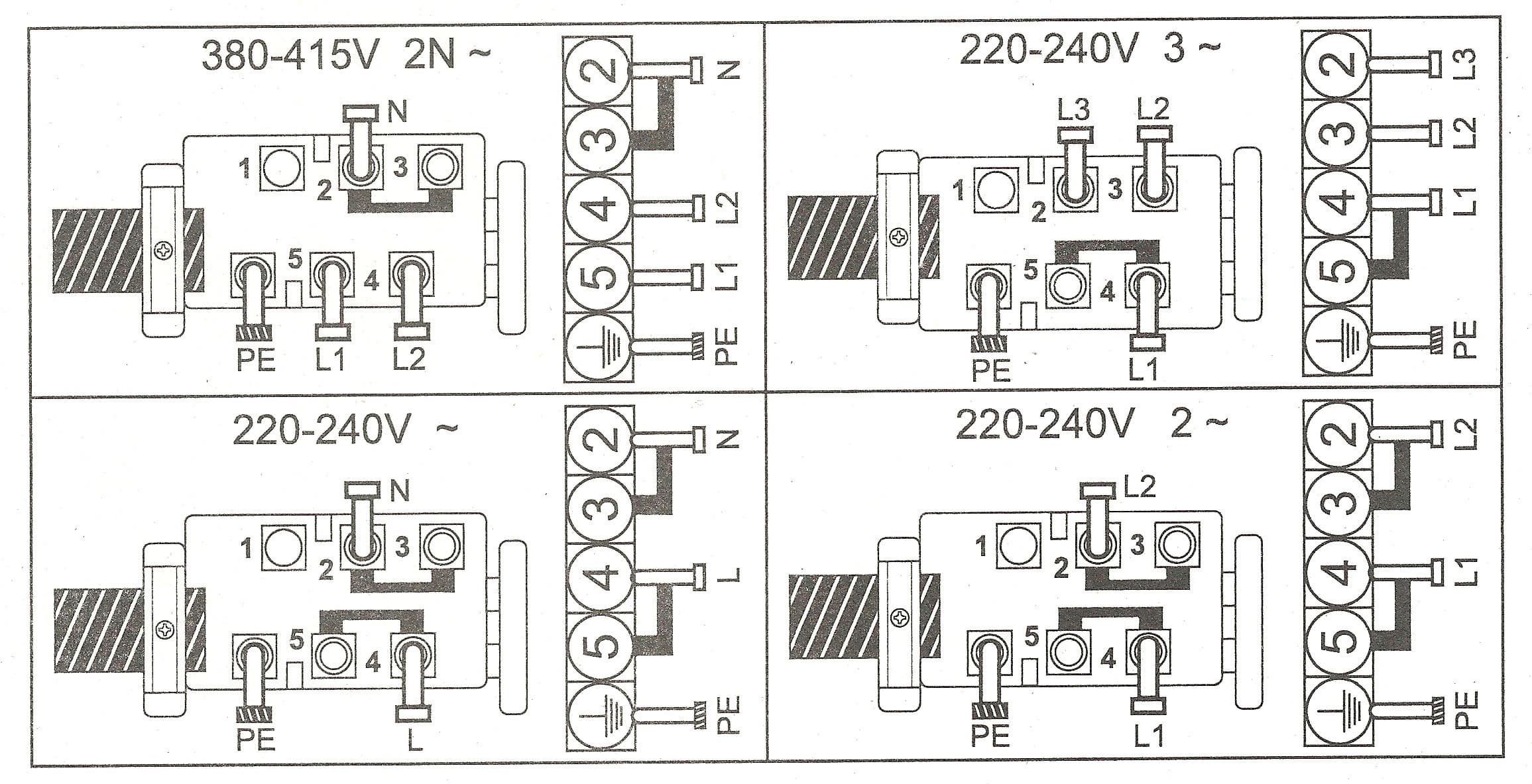 По умолчанию подключение рассчитано на однофазную сеть 220-240 вольт, соответственно, синий провод — нейтраль, коричневый — фаза, желто-зеленый — земля. Также возможны варианты двухфазного подключения 220-240 В (ничего менять не нужно), трехфазного 220-240 В и трехфазного 380-415 В (придется перевинтить клеммы со стороны варочной панели).
