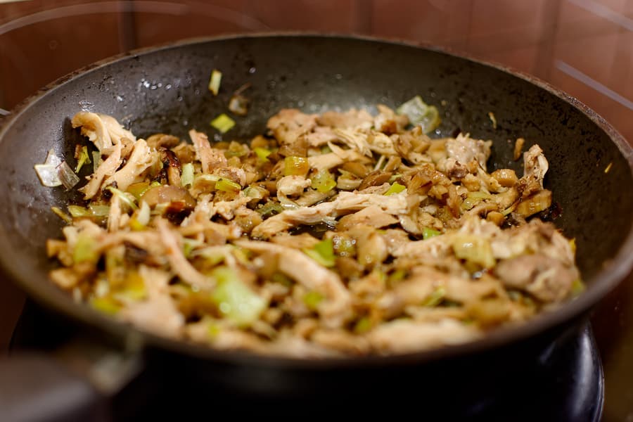 На сковороде обжарили шампиньоны, лук порей, в конце добавили отварное филе куриного бедра. Убедились, что функция быстрого нагрева работает эффективно и жарить вполне удобно. С удовольствием использовали старую сковородку, которая существенно шире максимальной конфорки — прекрасно жарится, хотя мешать, конечно, приходится.