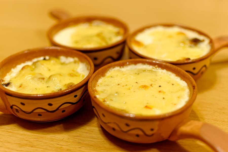Затем разложили по кокотницам, залили сливками и накрыли сыром. Запекли в микроволновке с функцией конвекции, что уже строго к тесту не относится — этот тест был про радость от использования сковородок любого состава и диаметра.