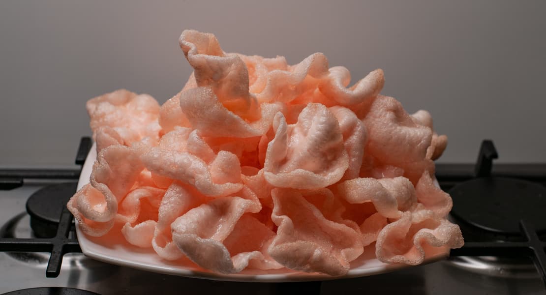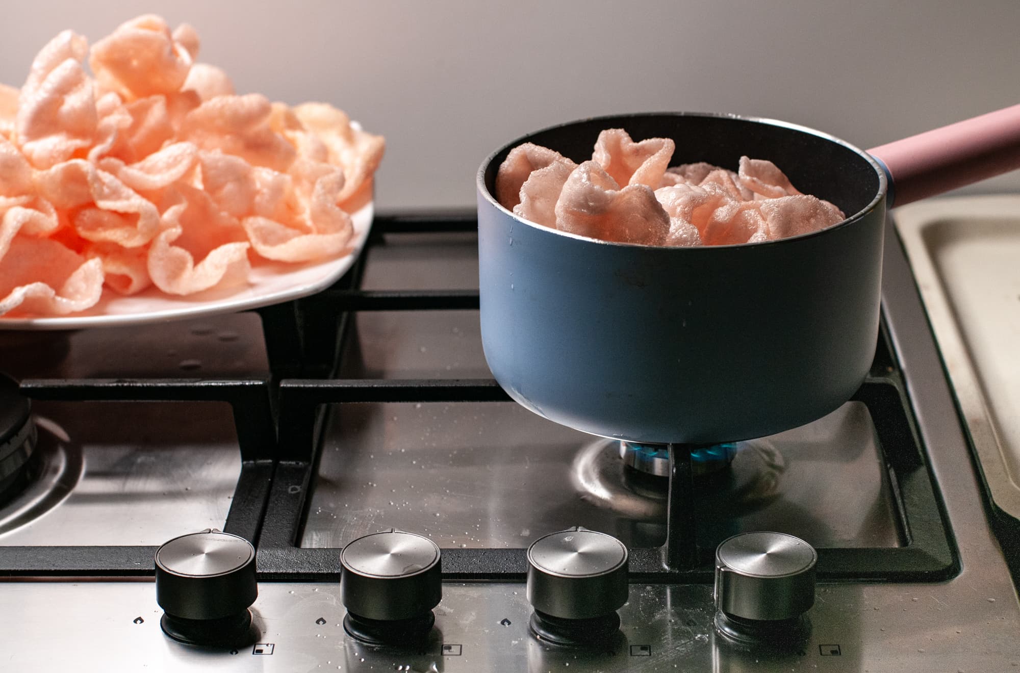 Для правильного приготовления креветочных чипсов очень важно выдержать нужную температуру фритюра, иначе они получаются недостаточно воздушными или теряют вкус. Для того чтобы добиться температуры 175-180 °C, мы использовали маленькую конфорку, регулируя на ней мощность высотой пламени. Фритюрницей служил ковшик 16 см диаметром. Температуру измеряли термощупом, сырье для чипсов использовали промышленного китайского производства.