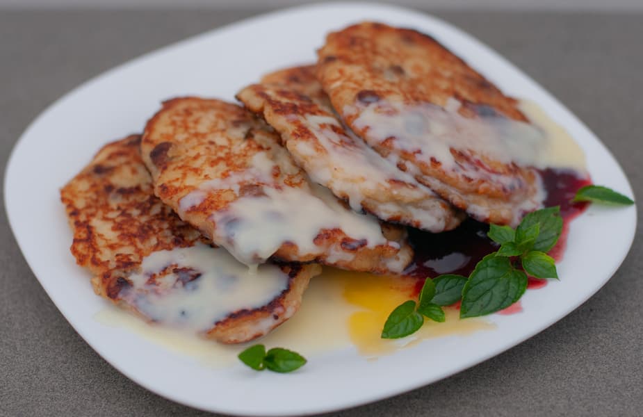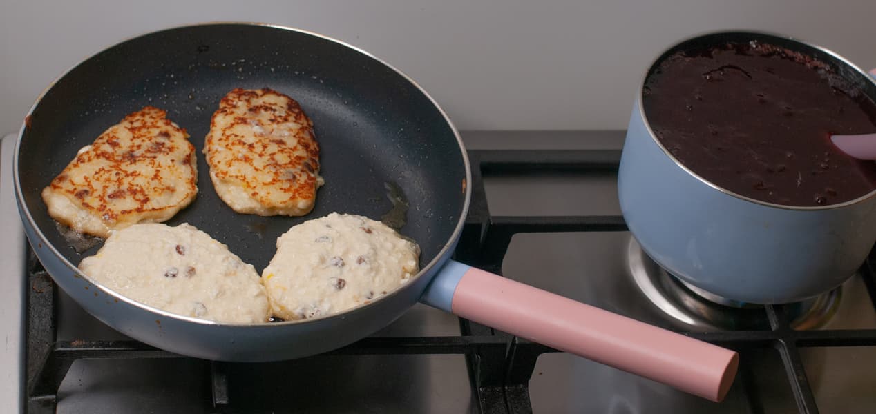 Сырники жарили на сковороде ∅25,5 см на сливочном масле из теста, состоящего из зерненого творога и яиц с небольшим добавлением муки и изюма. Плита работала равномерно, температуру удалось подобрать удобную, сырники получились отлично.