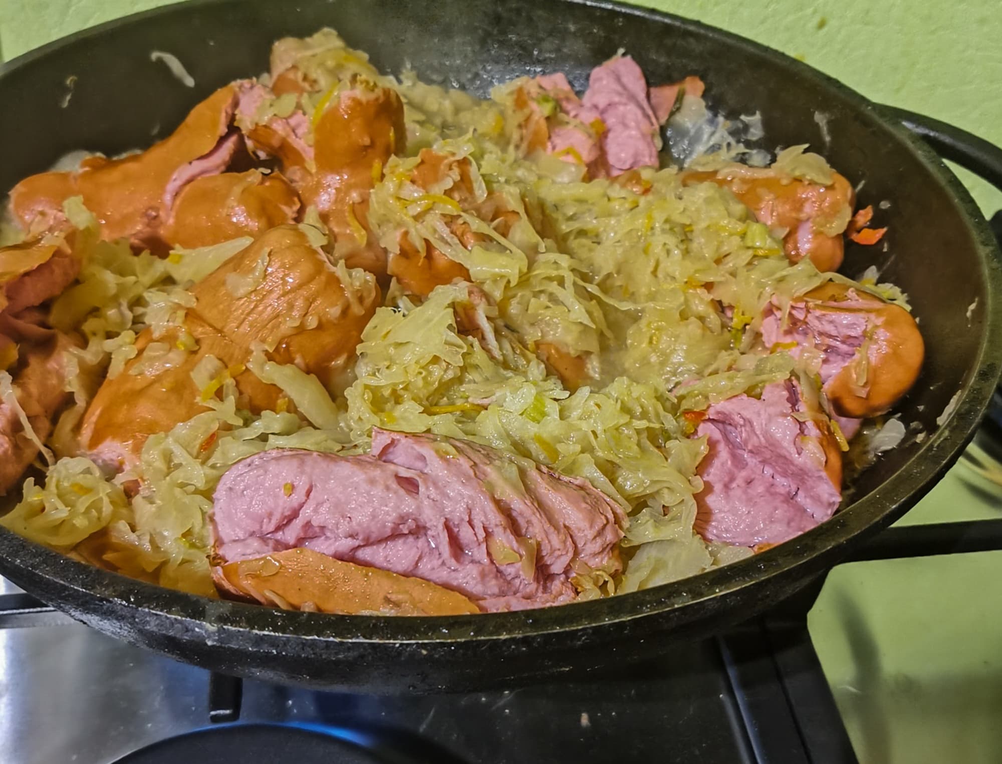 В середине процесса в капусту добавили специи и бекон, после 2 часов, когда капуста потеряла примерно половину объема, положили 1 кг сарделек. Тушили до полной готовности сарделек.