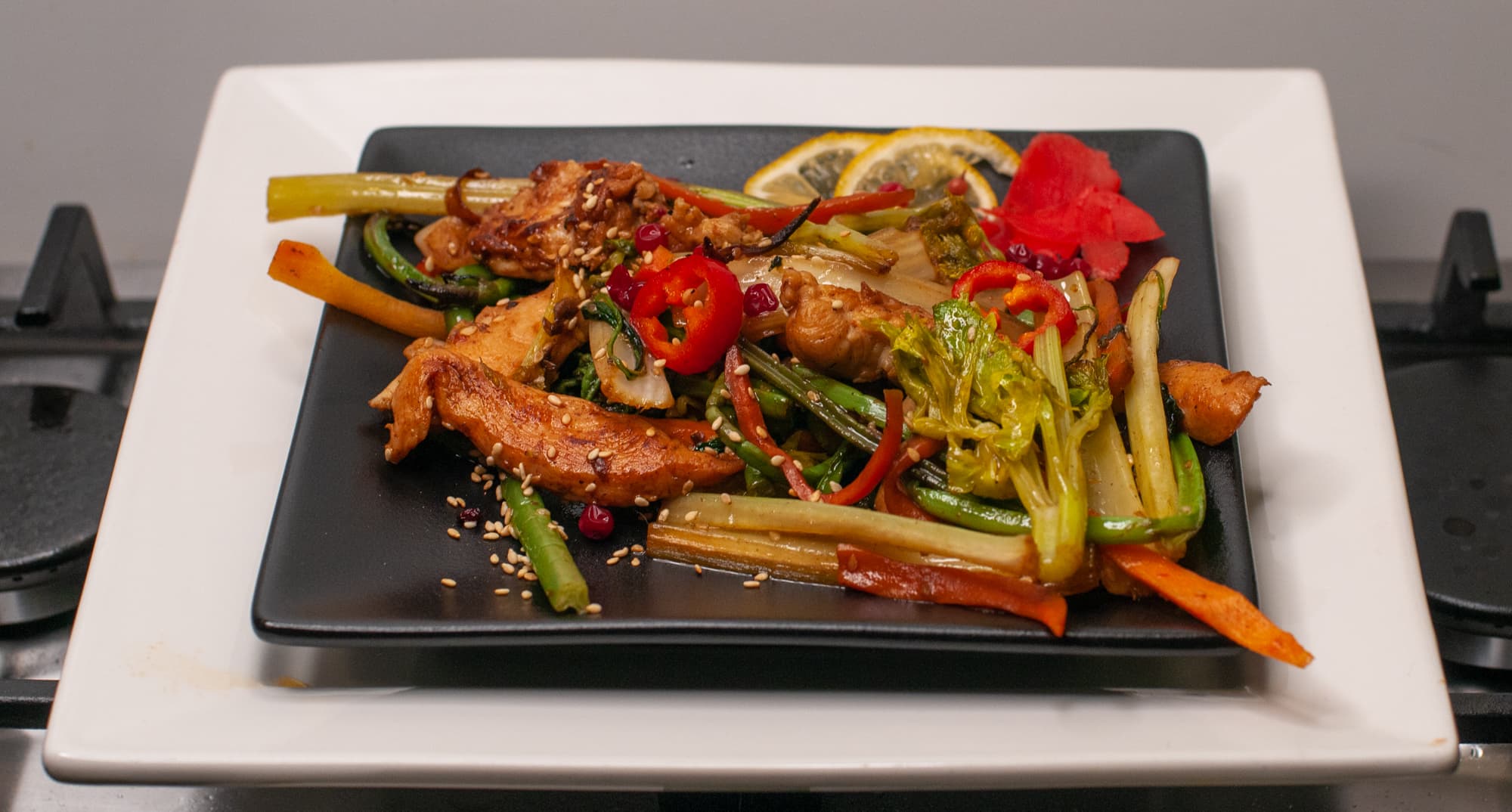 Для блюда использовали замаринованное филе курицы, грибы, морковь, стебли сельдерея, острый перец, шпинат, папоротник, кунжут, специи.