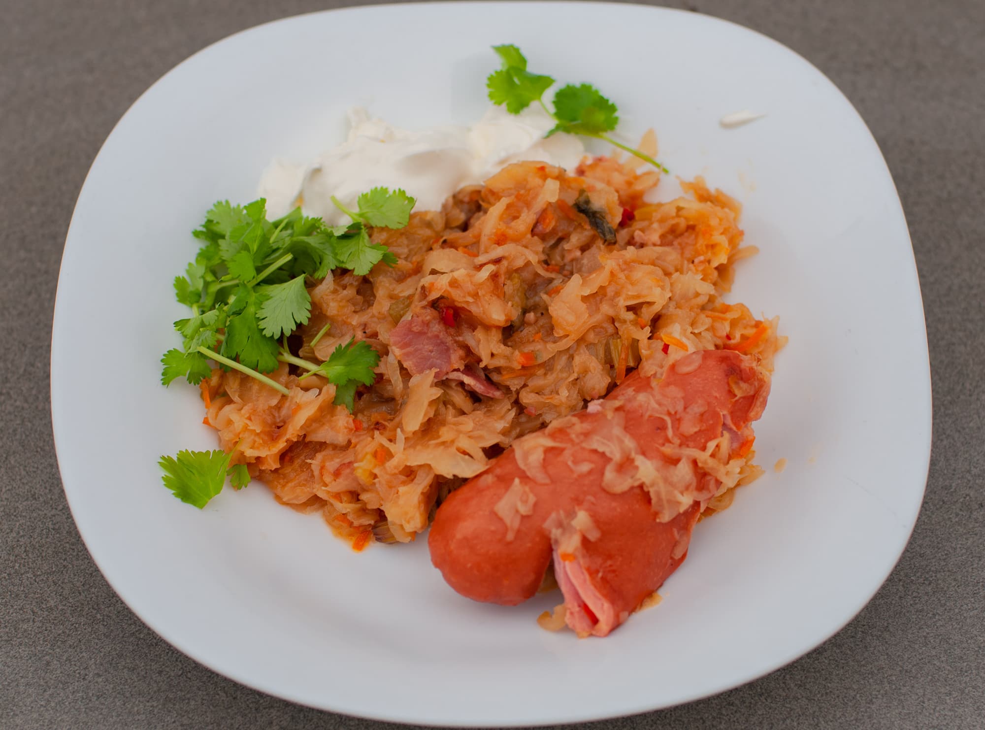 Мы сделали вариацию польского бигуса из квашенной капусты, острого перца, специй, бекона и сарделек.