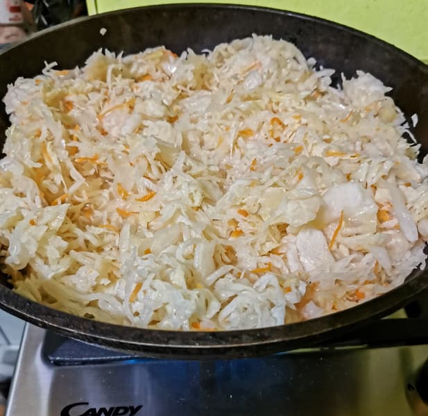 Для приготовления мы взяли сковороду большой емкости диаметром 33 см со скругленным дном (по рекомендации производителя лучше брать посуду с плоским дном, но ее не оказалось подходящего размера). В сковороде на протяжении 2 часов мы тушили 2 кг квашенной капусты с подсолнечным маслом, изредка добавляя воду и периодически накрывая крышкой.