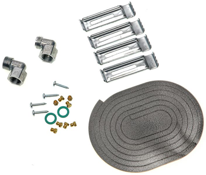 Для монтажа и подключения к газовой магистрали поверхности Candy CHG6BF4WPX в комплекте дано все необходимое — монтажные скобы фиксаторы, шурупы, уплотнительные газовые прокладки 2 шт, 2 угловых штуцера (под цилиндрическую и коническую резьбу). Между столешницей и панелью прокладывается уплотнительная лента, которая тоже входит в комплект.