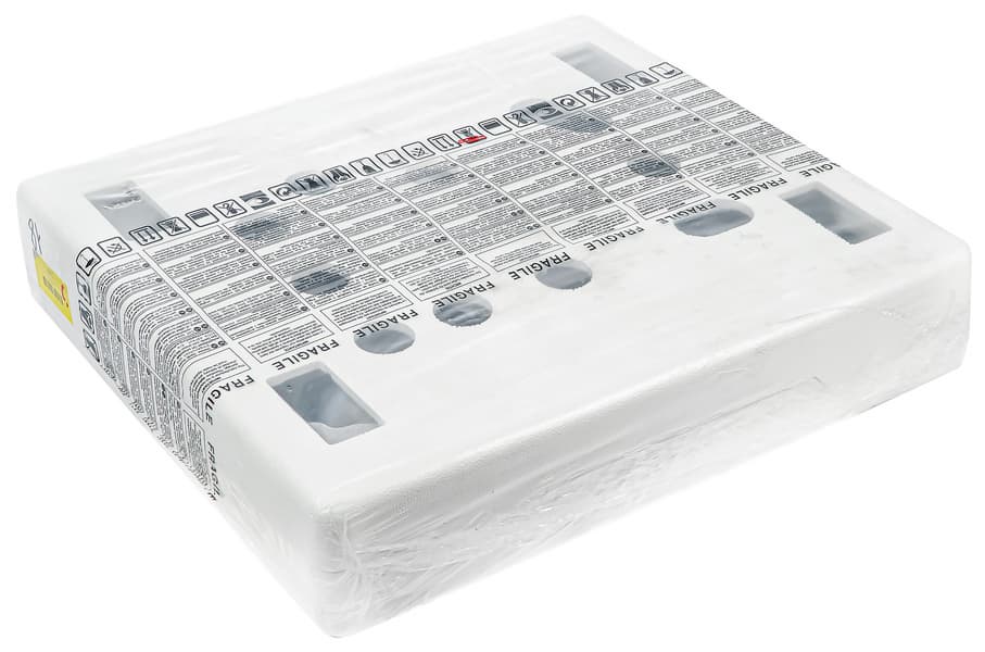 Варочная газовая панель пришла на тесты упакованной в пенопластовые защитные элементы, сделанные точно под ее размер. Конструкция сверху дополнительно обтянута полиэтиленовой пленкой с напечатанными на ней транспортировочными пиктограммами. Упаковка надежно защищает плиту от неприятностей при доставке.
