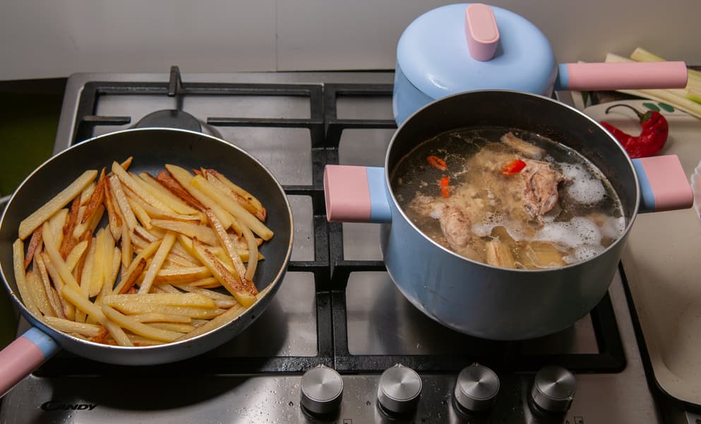 Мы решили приготовить куриный бульон, а одновременно с ним рассыпчатый рис и жареную картошку в качестве наполнителя для бульона.