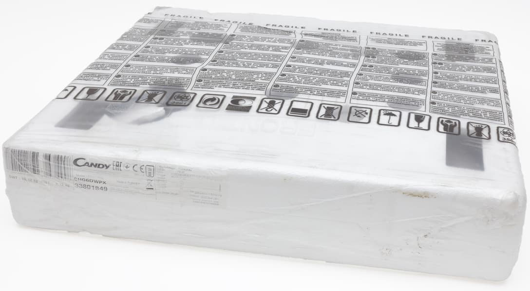 Варочная газовая панель пришла на тесты упакованной в пенопластовые защитные элементы, сделанные точно под ее размер. Конструкция сверху дополнительно обтянута полиэтиленовой пленкой с напечатанными на ней транспортировочными пиктограммами. Упаковка надежно защищает плиту от неприятностей при доставке.