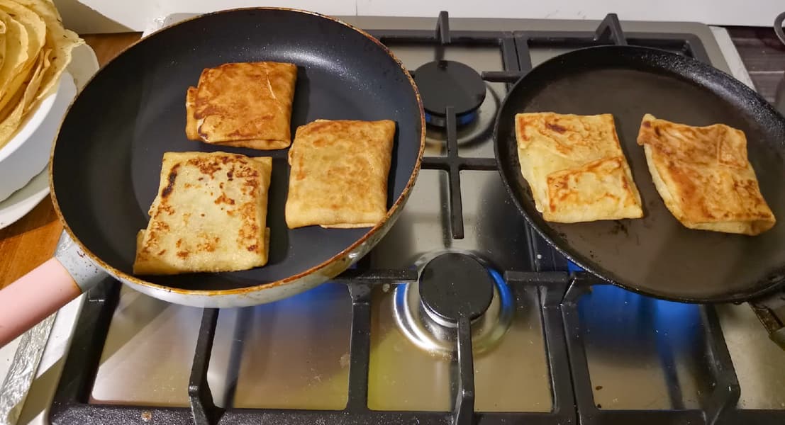 Блинчики начинили фаршем, свернули и повторно обжарили на двух сковородках.