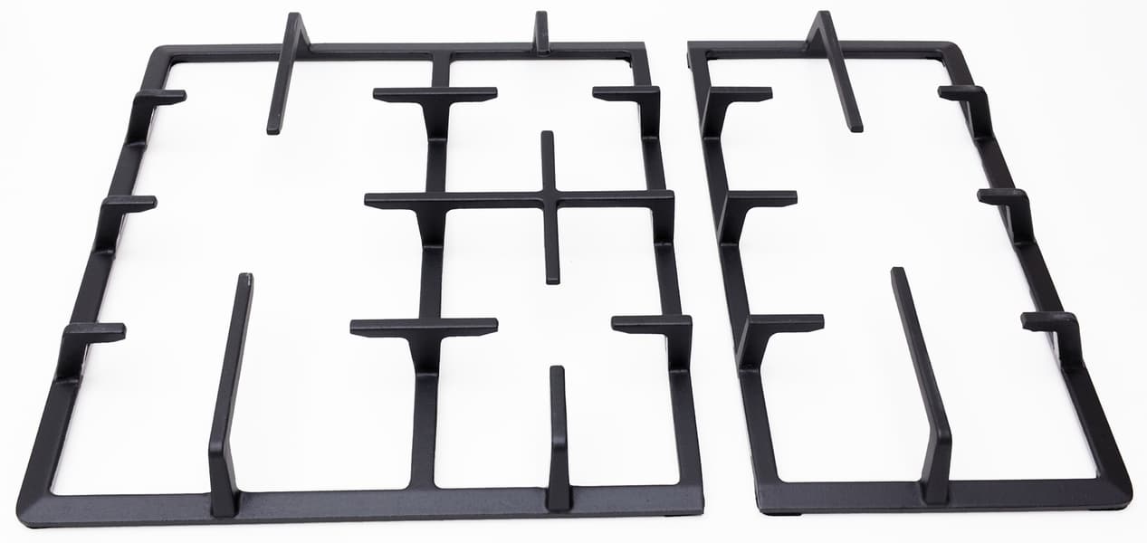 Решетки чугунные, разной величины. Левая захватывает 3 конфорки, правая — одну большую. Их удобно снимать и ставить на место и невозможно перепутать.