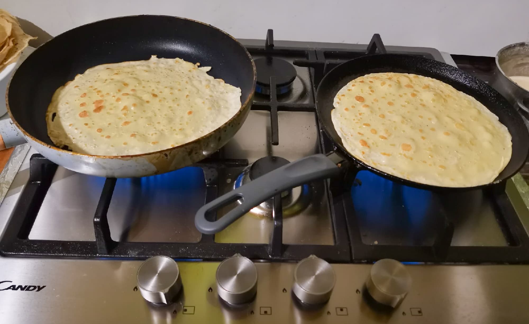 Тонкие блинчики из муки, воды и яйца жарили на двух сковородках диаметром 24 и 28 см одновременно. Работать с двумя большими сковородками на этой плите вполне удобно.