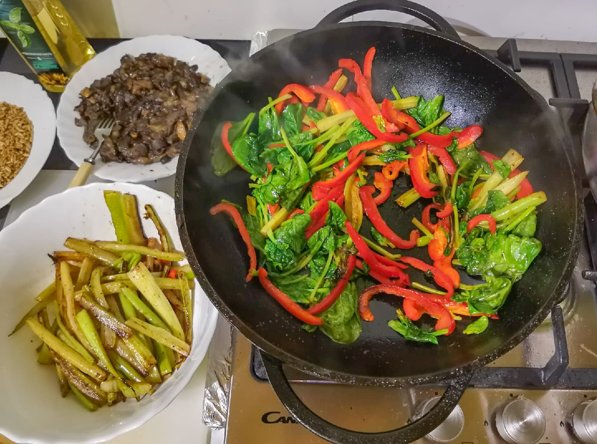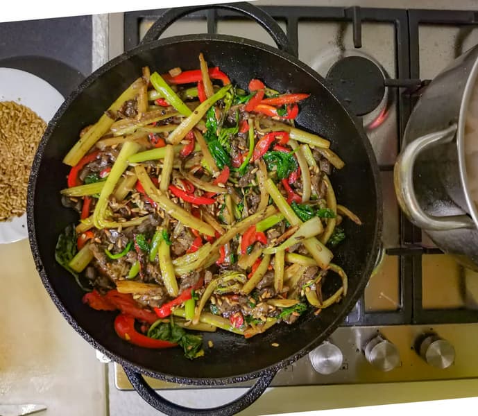 Затем сделали вок из стеблевого сельдерея, болгарского перца и специй, по готовности добавили в него свежий шпинат и немного бульона.