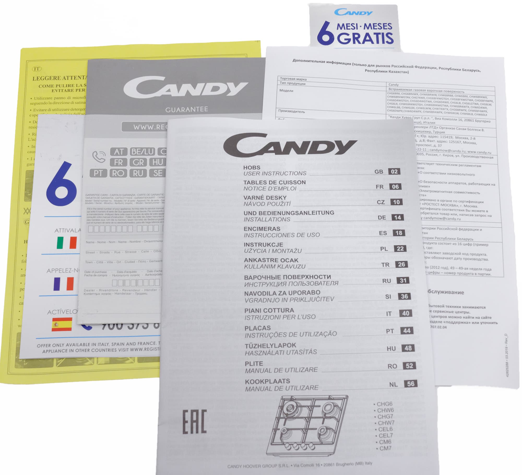 Руководство пользователя — брошюра альбомного формата на 14 языках. Текст на русском языке уместился на 5 страницах и содержит информацию, общую сразу для нескольких моделей плит. Страницу занимает техника безопасности, еще страницу — инструкция по выполнению установки, выбору места установки, подключению к электросети и линии газоснабжения. Остальные разделы руководства — это инструкция по эксплуатации варочной поверхности, использование газовой конфорки, регулировка минимального пламени, обслуживание и чистка, защита окружающей среды и общая таблица характеристик 6 моделей плит данной линейки.