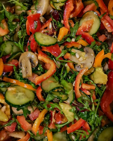 Выложили в подготовленную смесь из болгарского перца, помидоров, огурцов, авокадо, рукколы, ялтинского лука и кедровых орехов. Перемешали. Заправили оливковым маслом с розмарином.