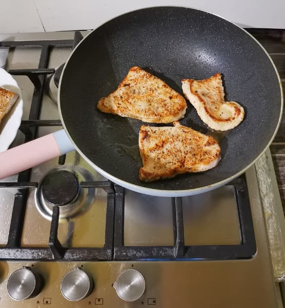 Для стейка мы взяли филе индейки, соль, перец, специи. Порционно нарезанную индейку обжарили на сильном огне с небольшим количеством масла. Для того чтобы стейк получился сочным, температура должна быть стабильной и высокой, а кусков на сковороде немного.