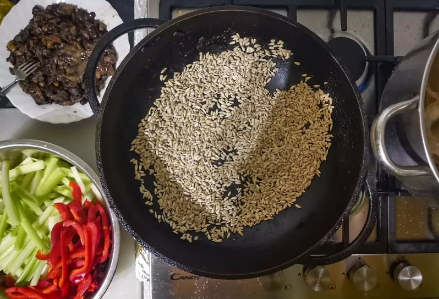 На сухой сковороде обжарили семечки подсолнечника. Одновременно с этим на второй большой конфорке у нас варился куриный бульон в 8-литровой кастрюле.