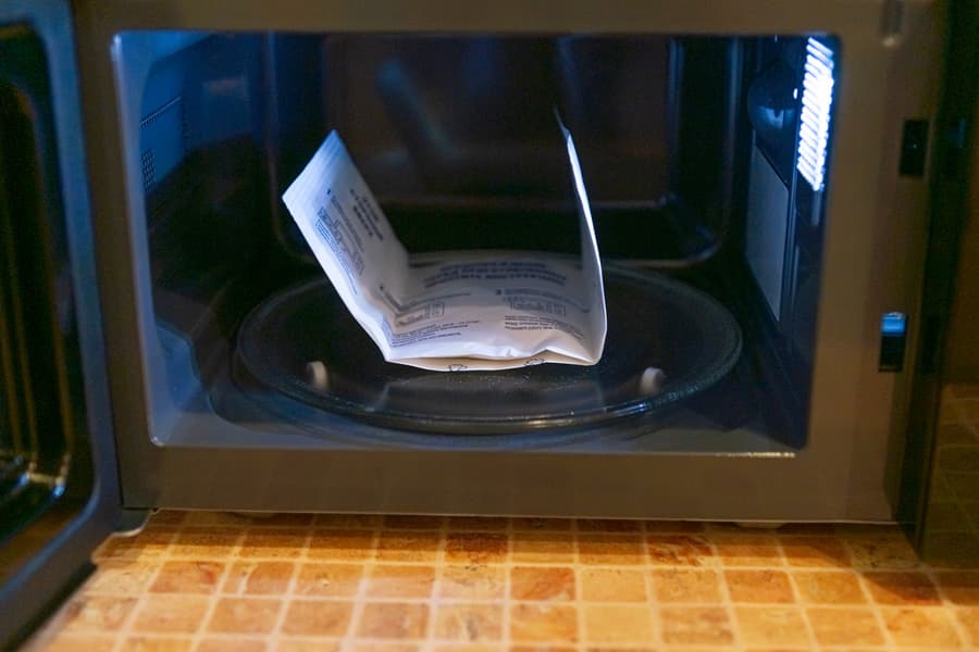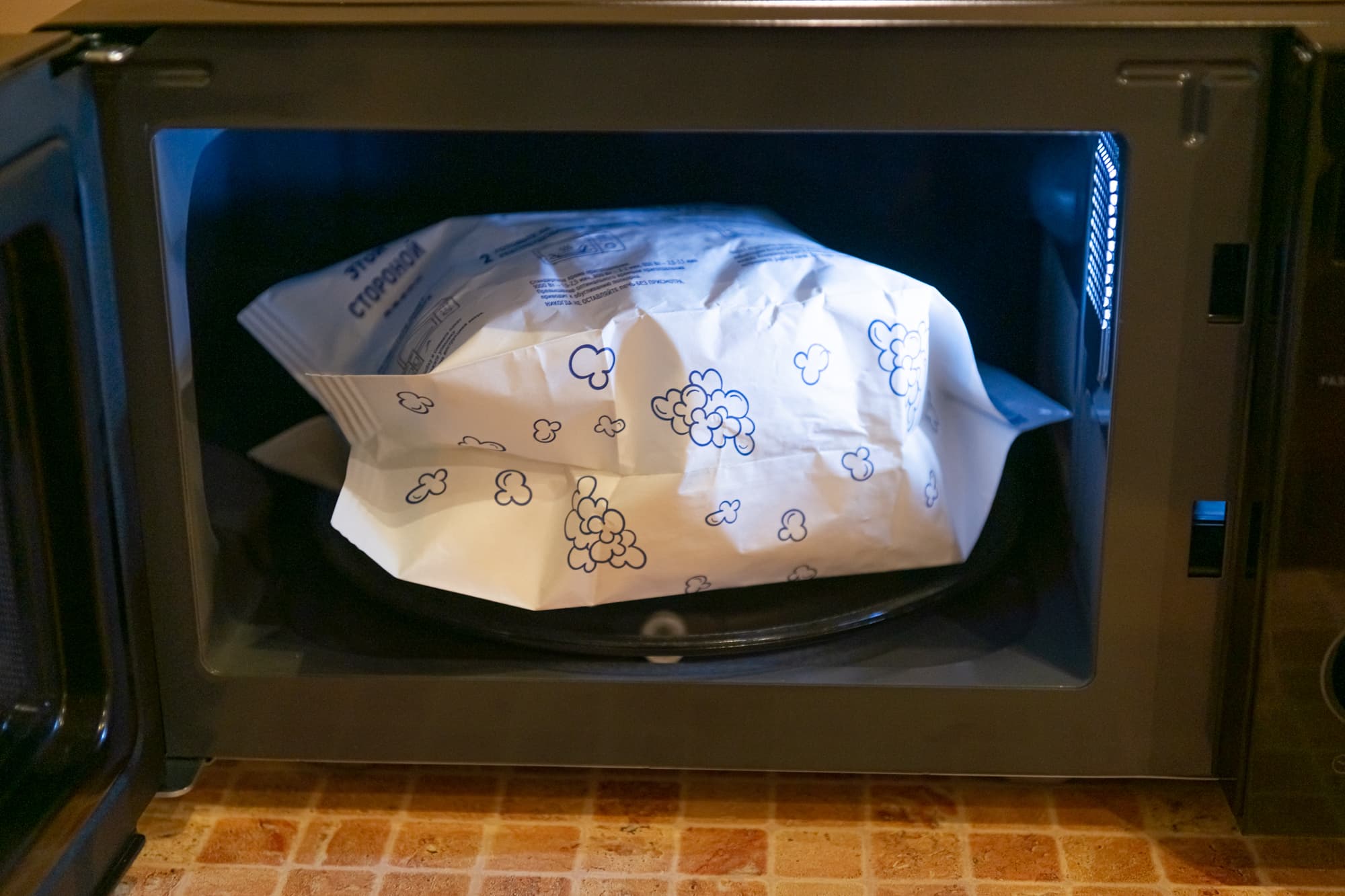 Поместили пакет попкорна весом 100 г на поддон и включили микроволновку на максимальной мощности на 3 минуты.