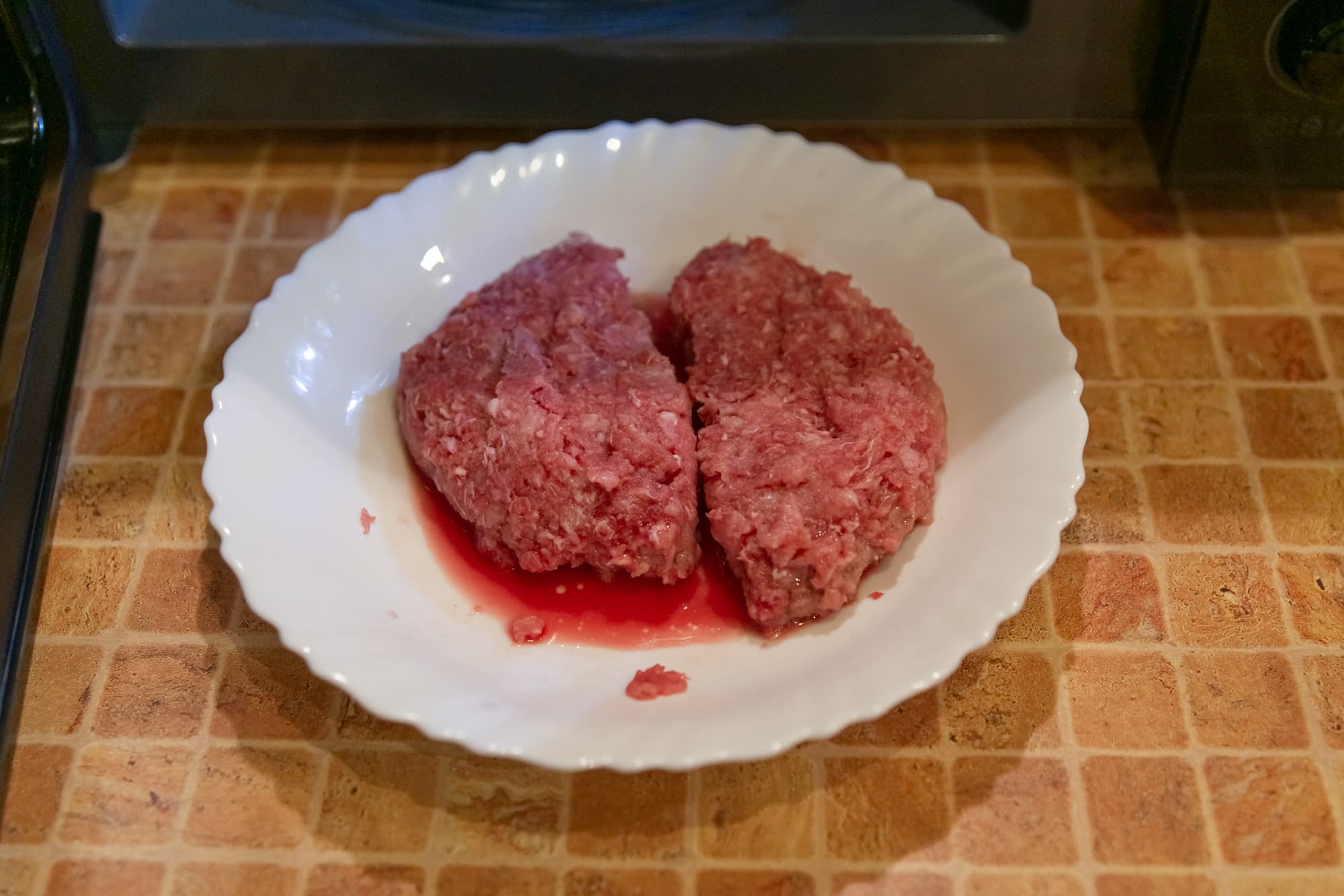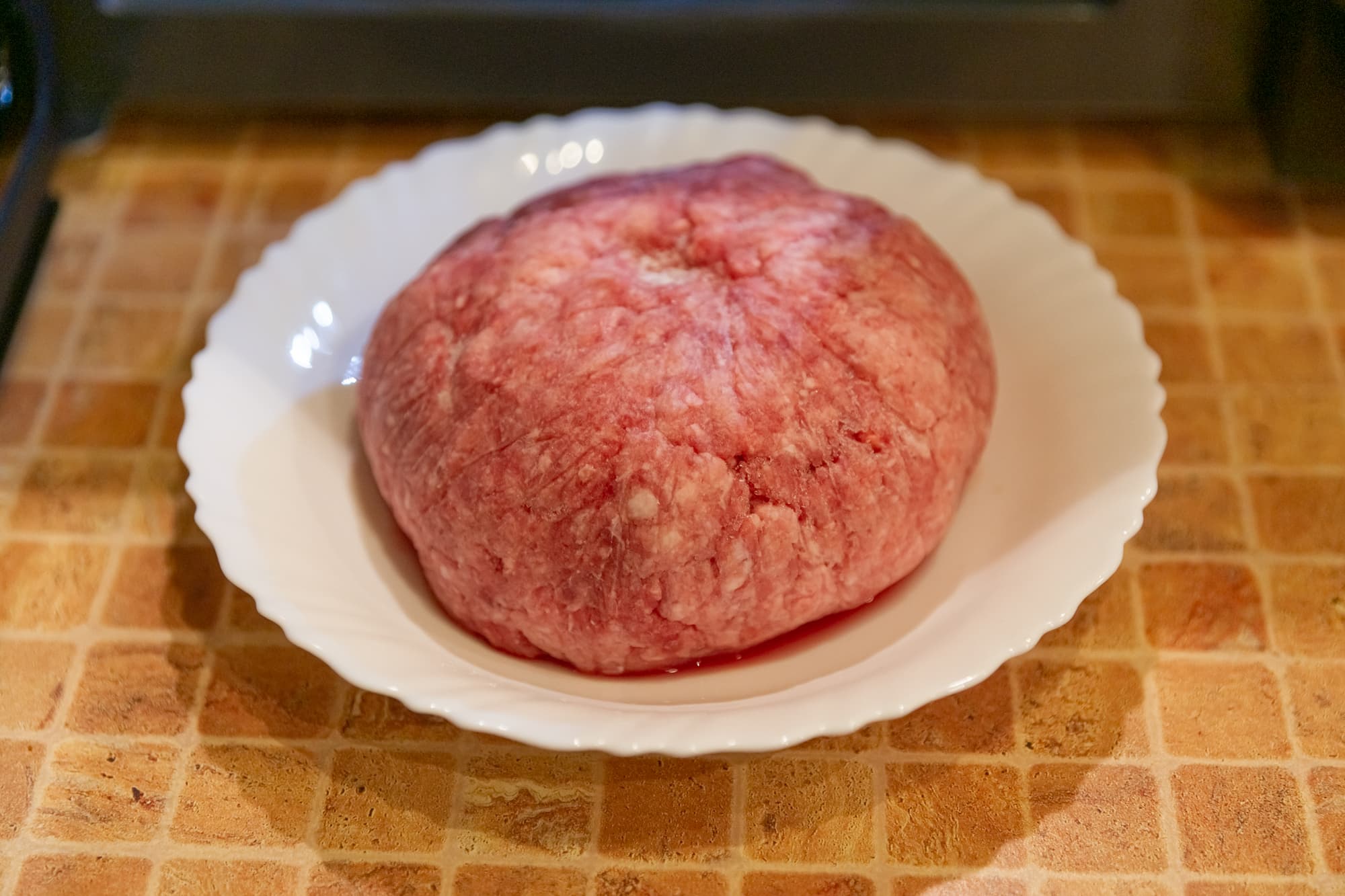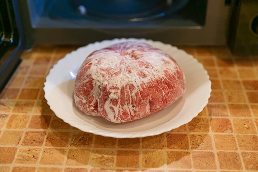 Для первого и традиционного теста мы взяли комок замороженного фарша из свинины и говядины (50% на 50%) и поместили в камеру, установив режим разморозки по весу. Печь решила, что на это уйдет 20 минут 30 секунд.
