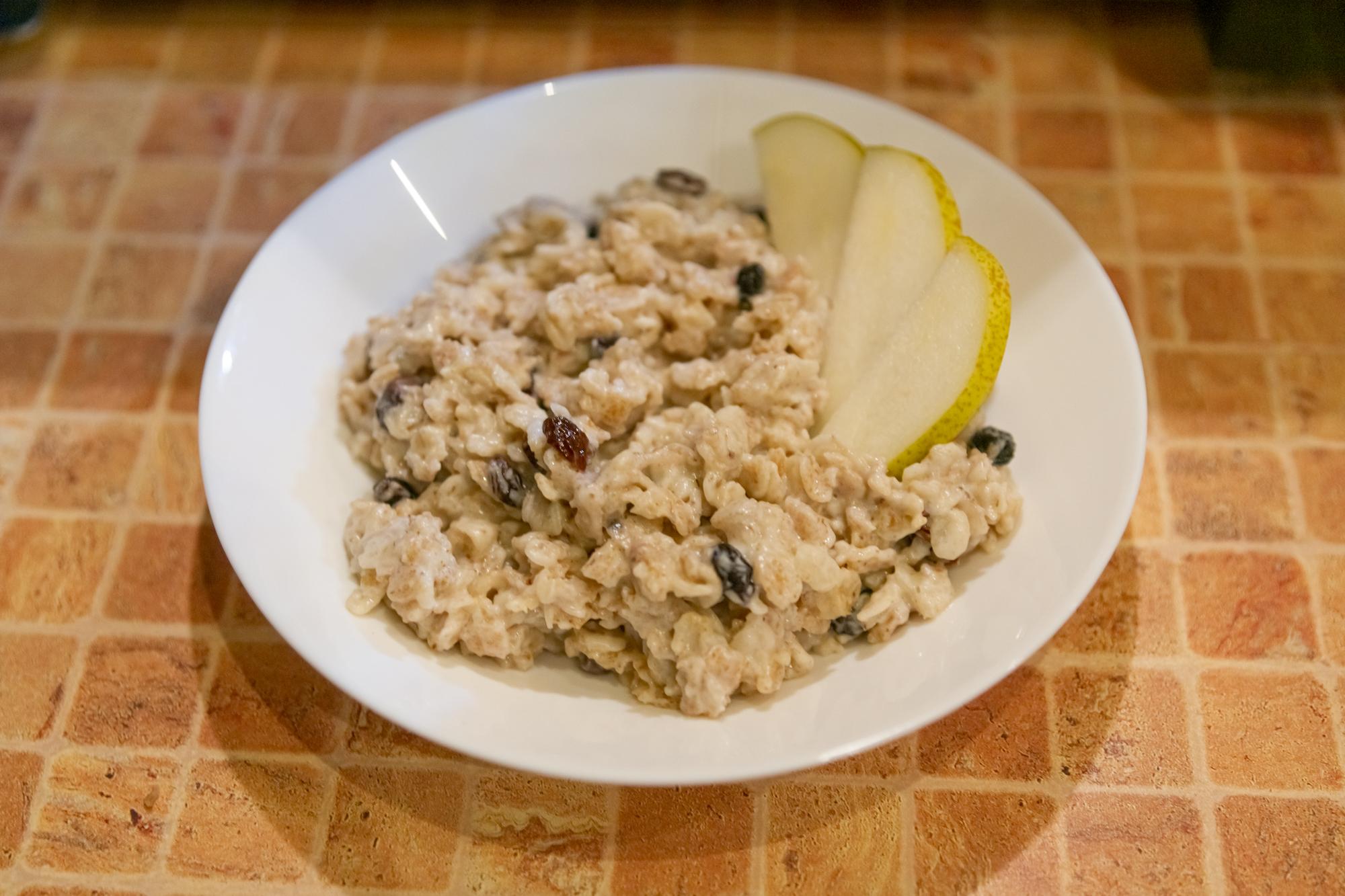 100 г овсяных хлопьев залили 150 мл воды и 150 мл молока. Добавили изюм, щепотку соли, сахар и перемешали. Поставили тарелку в микроволновку и установили мощность микроволн на 80%. На приготовление густой вкусной каши у нас ушло 15 минут.