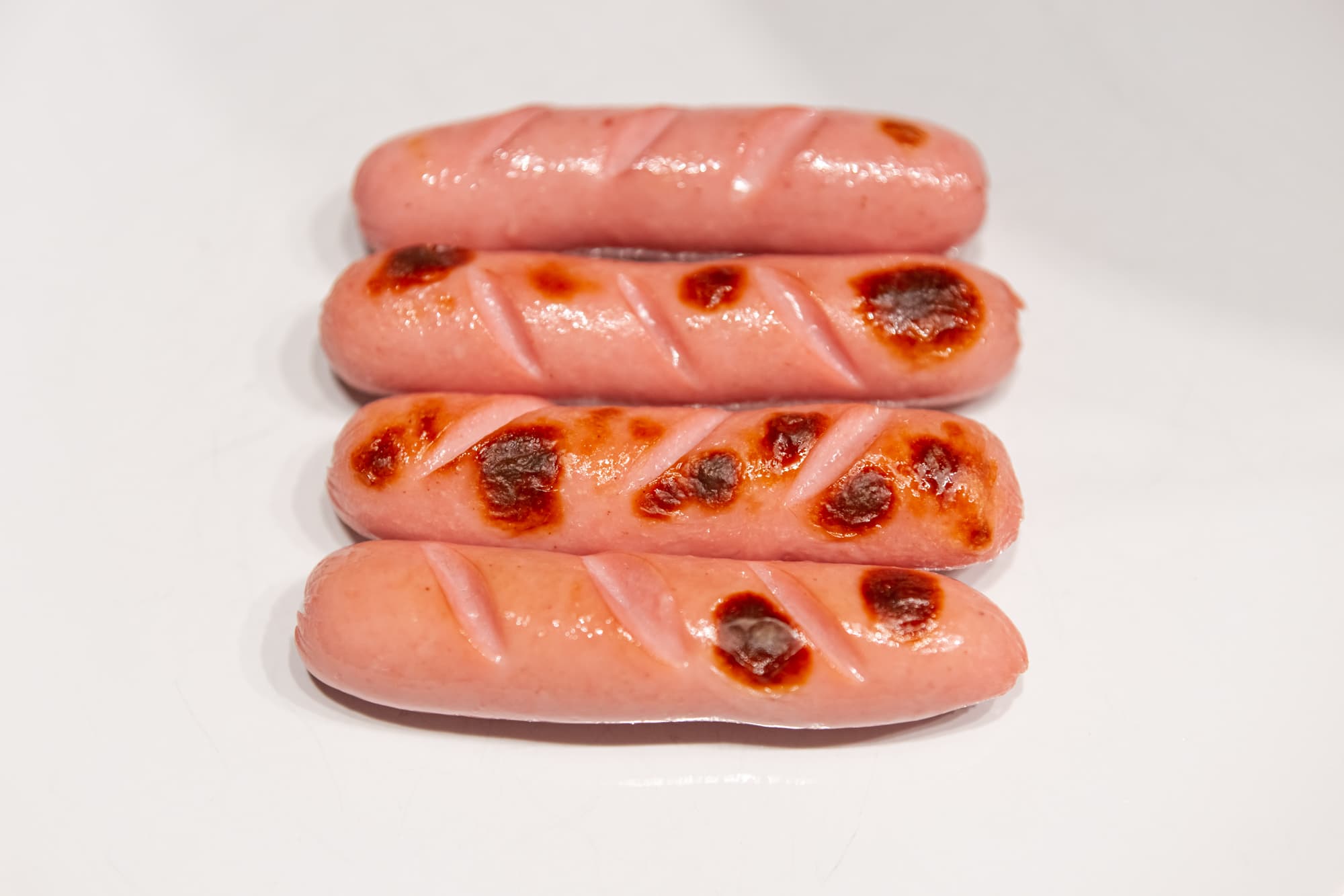 Четыре сосиски надрезали и уложили на решетку. Включили гриль и сразу выставили 10 минут. По окончании цикла открыли дверцу и увидели готовые, но всё еще бледные сосиски. Добавили 5 минут. Теперь они подрумянились, но, как видите, не все одинаково.