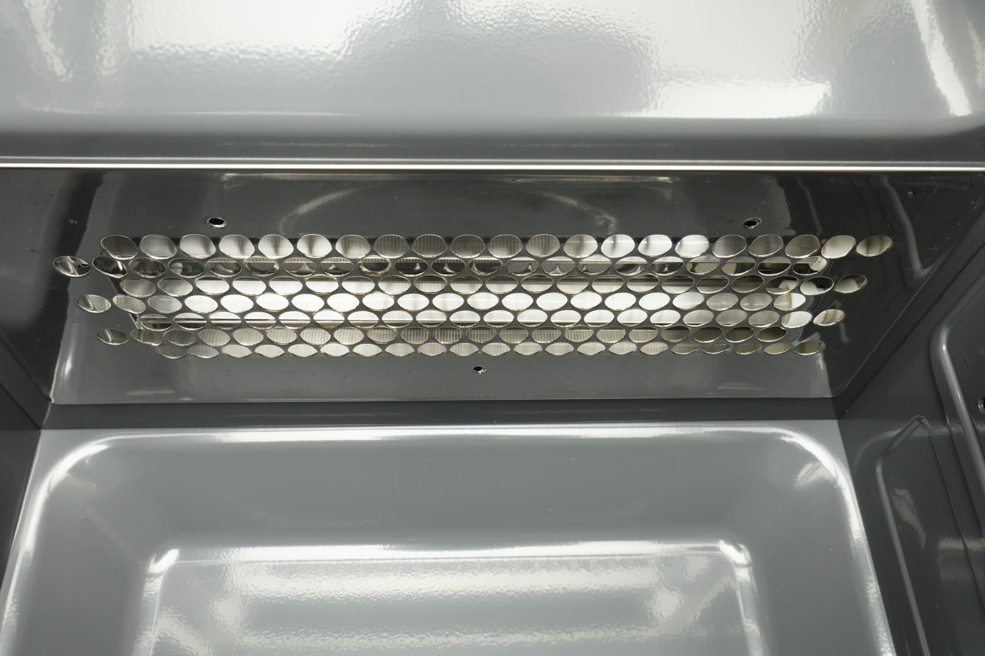 Кварцевый гриль скрывается за решеткой с круглыми отверстиями вверху камеры.