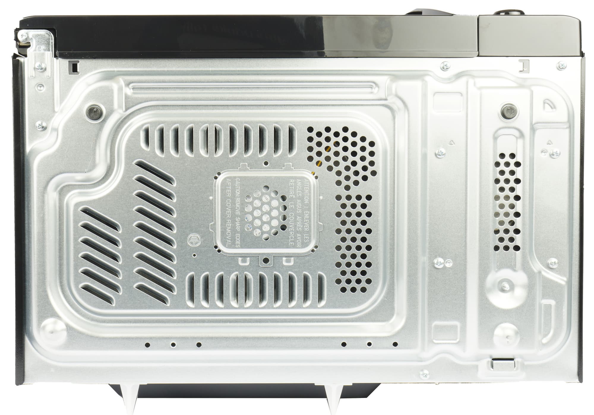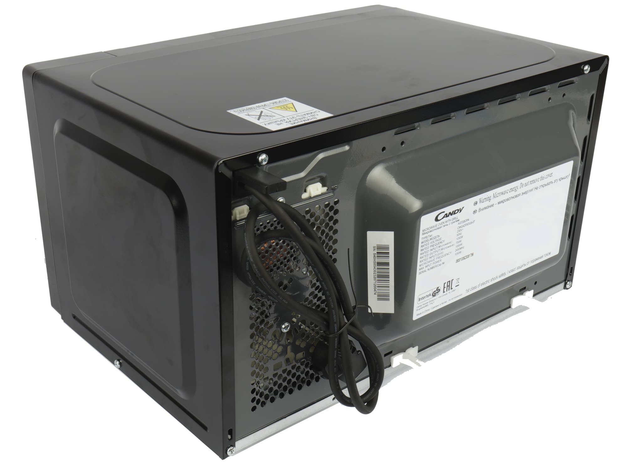 На металлической задней стенке также есть отверстия для вентиляции, выпуклый защитный экран, а на нем шильдик с технической информацией о приборе. Вверху слева выход шнура электропитания с вилкой, оснащенный ограничителем, препятствующим установке прибора вплотную к стенам или мебели. Два белых ограничителя внизу служат для того же.