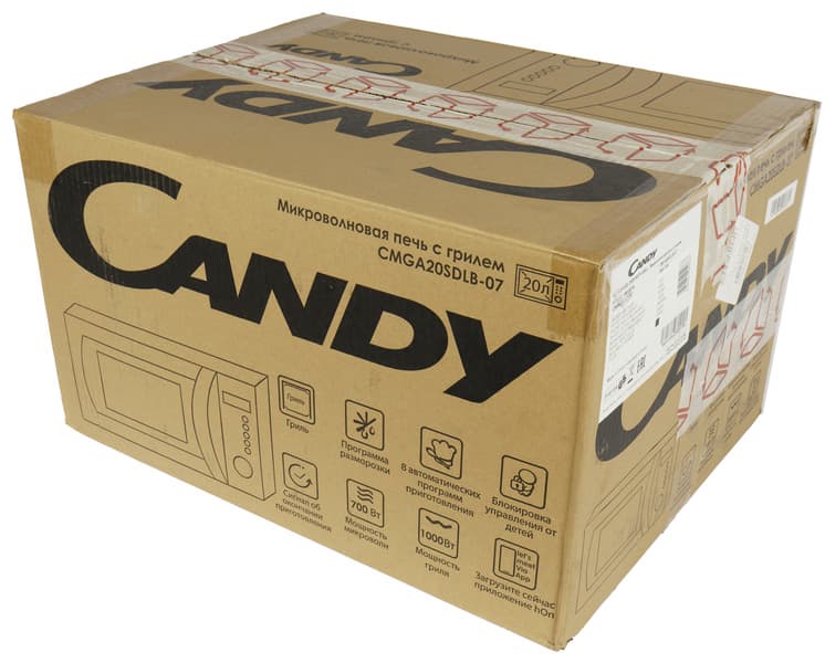 Candy CMGA20SDLB-07 — отдельностоящая микроволновая печь с 20-литровой рабочей камерой, поворотным столом, 8 автопрограммами, грилем, функцией отложенного старта, возможностью установки поэтапного приготовления на 2 шага и блокировки панели управления от детей. Мощность микроволн прибора составляет 700 Вт, а гриля — 1000 Вт.
