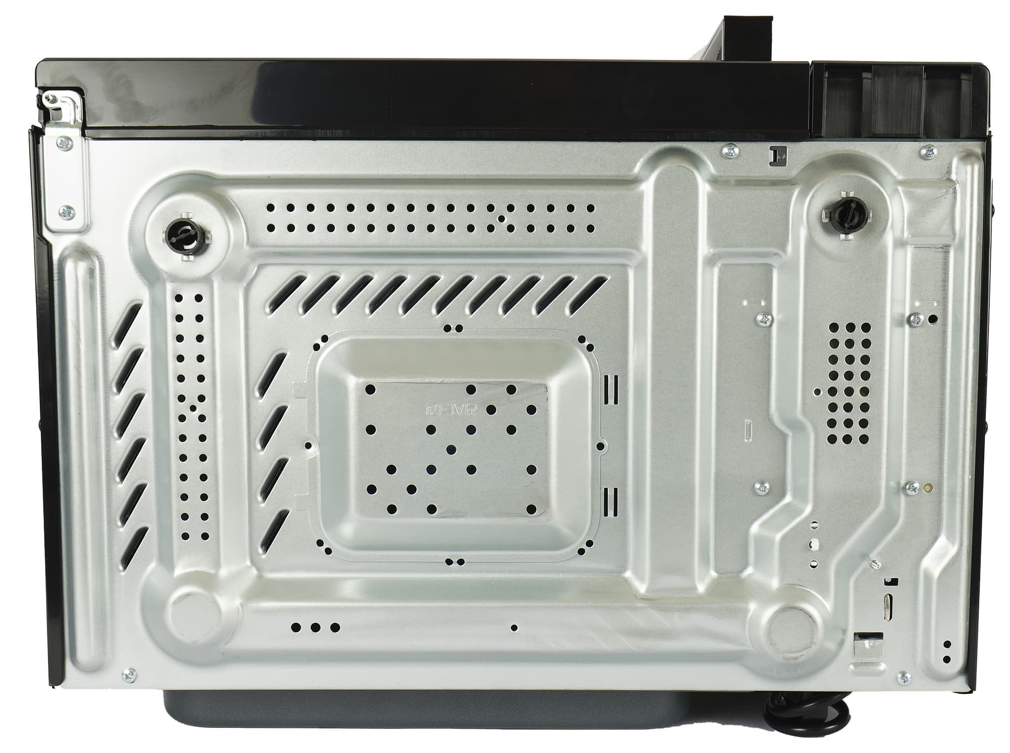 Дно микроволновой печи также ничем нас не удивило: воздухоотводные отверстия и две невысокие ножки. Никакими уплотнителями или накладками ножки не оснащены, но корпус стоит на поверхности стола надежно и без скольжения — видимо, для устойчивости достаточно веса прибора.