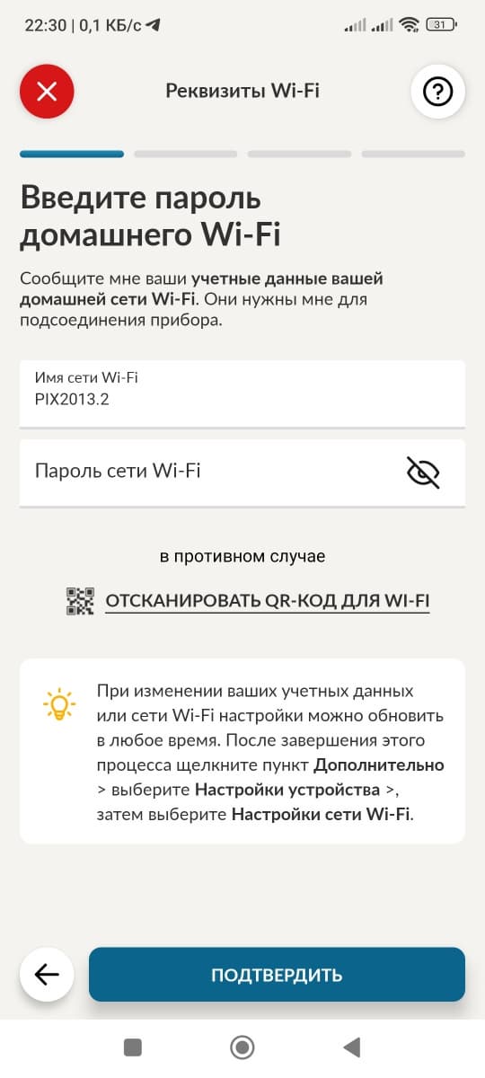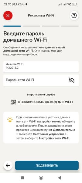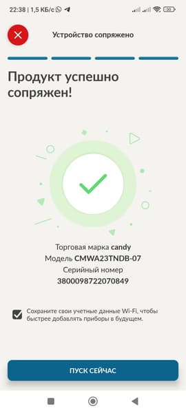 Для начала в приложении нужно зарегистрироваться, затем настроить сопряжение с прибором. Для этого понадобится пароль от Wi-Fi (мы обошлись без ввода пароля) и серийный номер или QR-код прибора. QR-кода на Candy CMWA23TNDB-07 нам обнаружить не удалось, поэтому пришлось вручную вводить серийный номер, который мы нашли на наклейке с техническими характеристиками на задней стенке прибора.