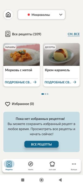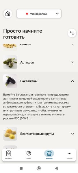 Во вкладке «Auto cook» можно узнать, как готовить конкретные виды продуктов. Весьма полезный и интересный, на наш взгляд, раздел.