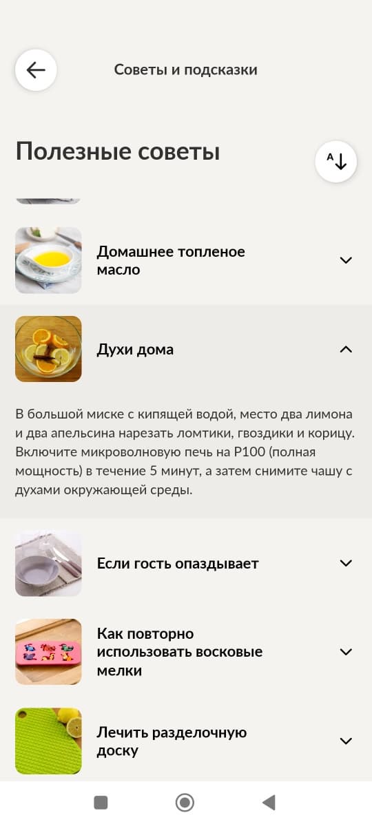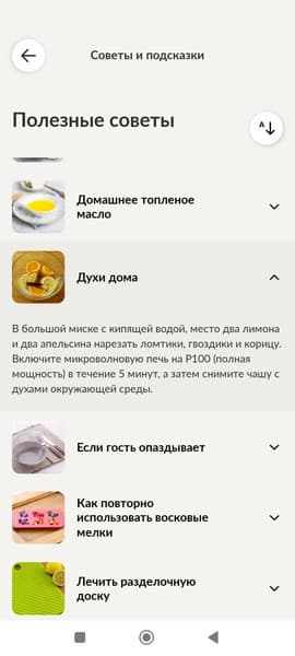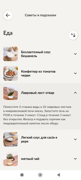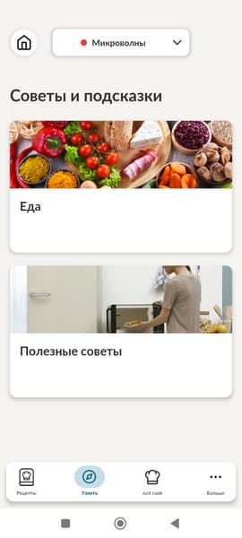 Вернемся на главную страницу и изучим другие вкладки: «Узнать» и «Auto cook». Вкладка «Узнать» содержит советы и подсказки по двум категориям: еда и полезные советы.