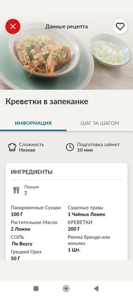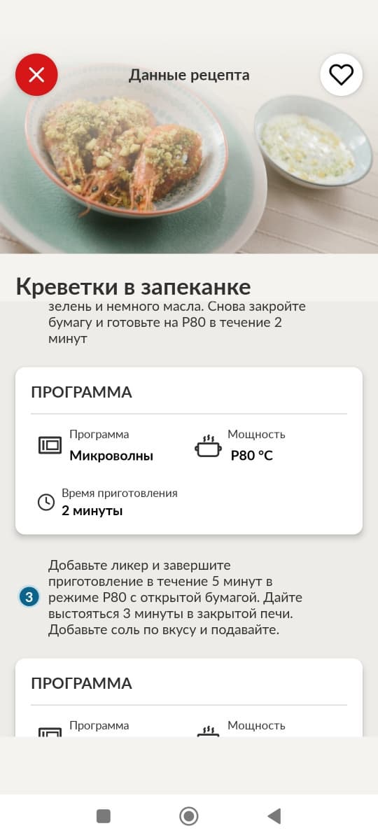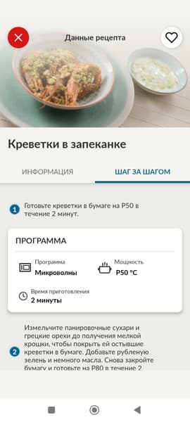 Заходим в сам рецепт: на левой вкладке представлен список ингредиентов, на правой — последовательность приготовления с описанием необходимой программы микроволновой печи. Довольно подробно и удобно для восприятия.