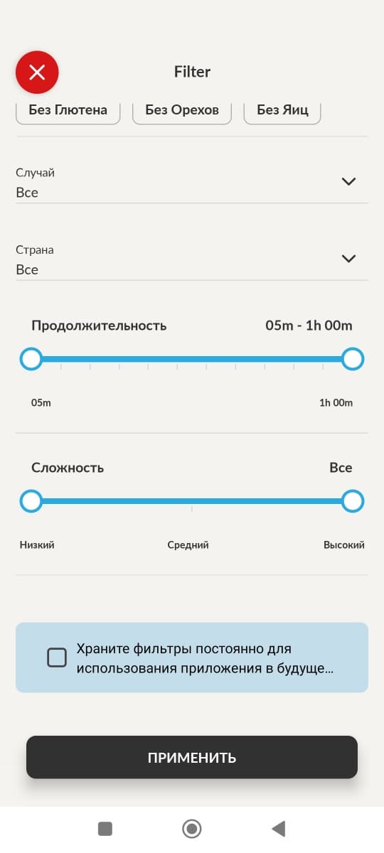 Фильтр довольно удобен и позволяет выбрать блюда по одному или нескольким критериям.